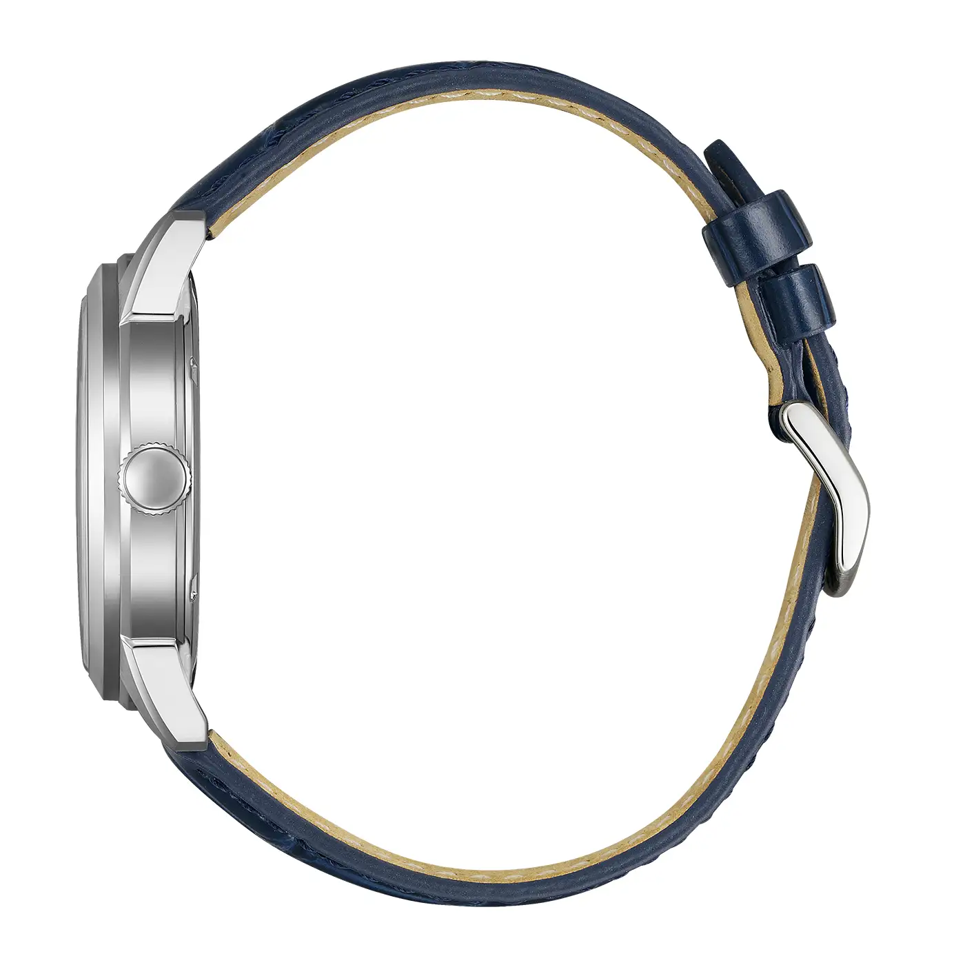 Citizen Elegance Classic AW0151-00L to wyrafinowana propozycja dla mężczyzn, którzy poszukują zegarka o tradycyjnym charakterze, wzbogaconego o nowoczesne detale. Głównym punktem projektu jest tarcza w głębokim odcieniu granatu, której centralna część posiada unikalną, ziarnistą strukturę. Ta subtelna tekstura przypominająca splot luksusowego materiału nadaje cyferblatowi wielowymiarowości i stanowi doskonałe tło dla polerowanego logo Citizen oraz ostro zarysowanych wskazówek.
