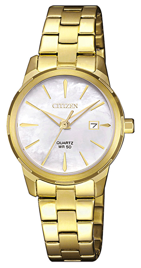 Citizen Elegance EU6072-56D to elegancki, pozłacany zegarek damski o niedużej średnicy (28 mm) stworzony przez japońską markę CITIZEN. Jego prestiżowa kolorystyka opiera się niemal wyłącznie na tonach żółtego złota. Wyjątek stanowi powierzchnia tarczy, która mieni się piękną i zmysłową masą perłową. To idealny model tak samo na co dzień, jak i na szykowne, wieczorne okazje. Unikalna tarcza posiada 12 nakładanych, ozdobnych indeksów, pozłacane wskazówki, logo oraz oznaczenie mechanizmu. Oprócz skali czasu i wskazań pokrytych substancją luminescencyjną na tarczy, na godzinie 3 obecny jest minimalistyczny datownik zamknięty w złotej ramce.