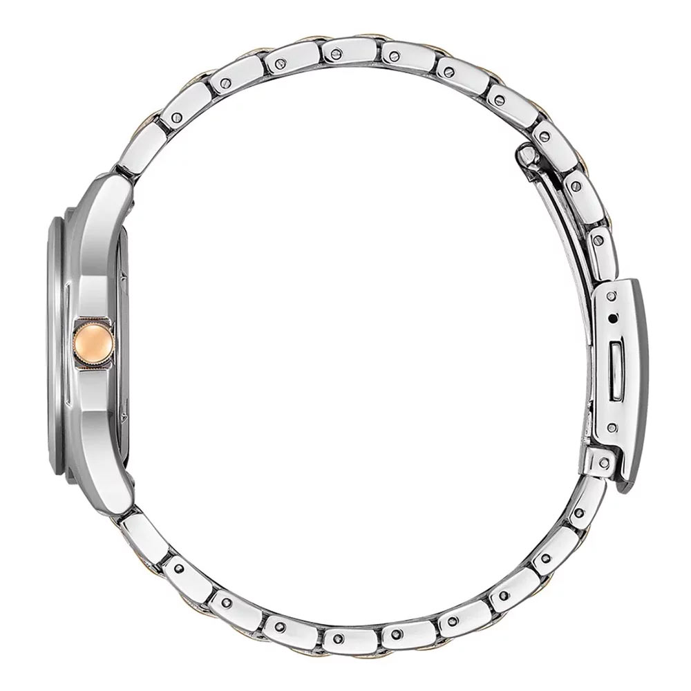 Citizen Classic Elegant FE2116-85A to zegarek dla pań ceniących modne wzornictwo i praktyczne zastosowanie. Czytelna tarcza w kolorze białym z eleganckim wzorem w postaci poziomych linii. W połączeniu z zaostrzonymi, złoconymi indeksami i wskazówkami dodaje klasy. Stalowa koperta o średnicy 31 mm zawiera w sobie technologię Eco-Drive. Mechanizm solarny, zasilany dowolnym źródłem światła. Obudowa jest zestawiona z lekką i elegancką bransoletą ze stali szlachetnej z elementami złoconymi różowym złotem PVD. Klasyczny zegarek Citizen idealnie pasuje do wieczornej kreacji, a jego wymiary sprawiają, że będzie idealnym towarzyszem na spotkaniach biznesowych jak i na co dzień.