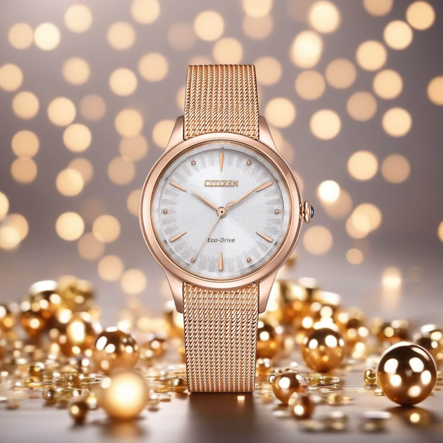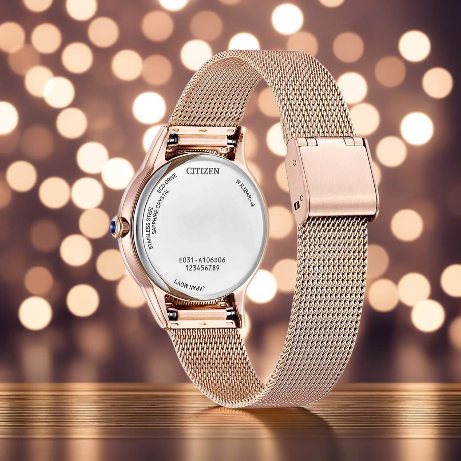 Zastosowana technologia Eco-Drive oznacza, że zegarek ładowany jest energią słoneczną, co eliminuje potrzebę regularnej wymiany baterii. Na tarczy znajduje się subtelny napis „Eco-Drive”, a powyżej logo marki „Citizen”. Zegarek ma również delikatnie zaokrąglone szkiełko szafirowe oraz dyskretną koronkę z ciemnym, ozdobnym akcentem na jej końcu.