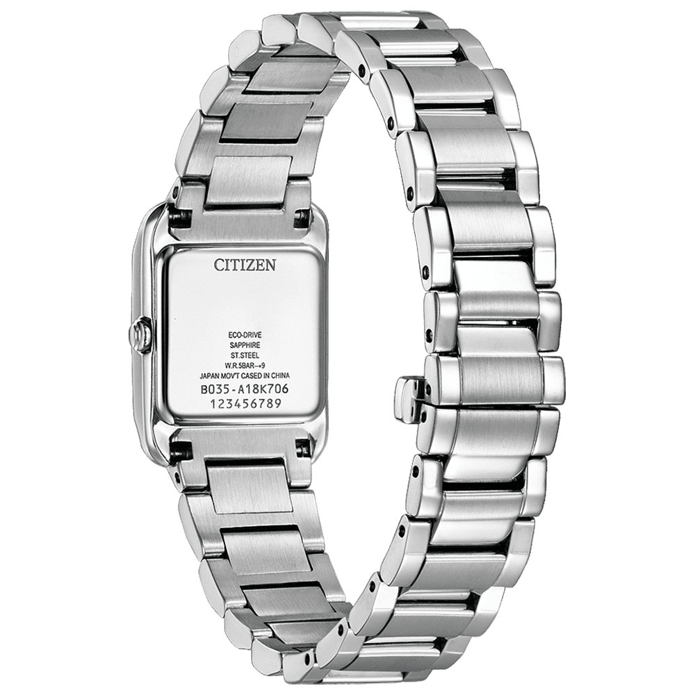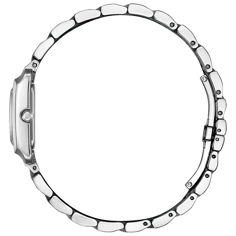 Zegarek damski z popularnej kolekcji Citizen Square to ponadczasowy design w łatwym do odczytania stylu. Lekko zaokrąglona kwadratowa koperta, odważnie szlifowane szafirowe szkło oraz perłowa tarcza nadają eleganckiego wyglądu. Model ten emanuje starannym designem, a na tarczy zostały umieszczone indeksy w postaci cyfr arabskich. Pozycja cięcia zakrzywionego szkła szafirowego została dostosowana w celu ograniczenia odblasków i zwiększenia widoczności.