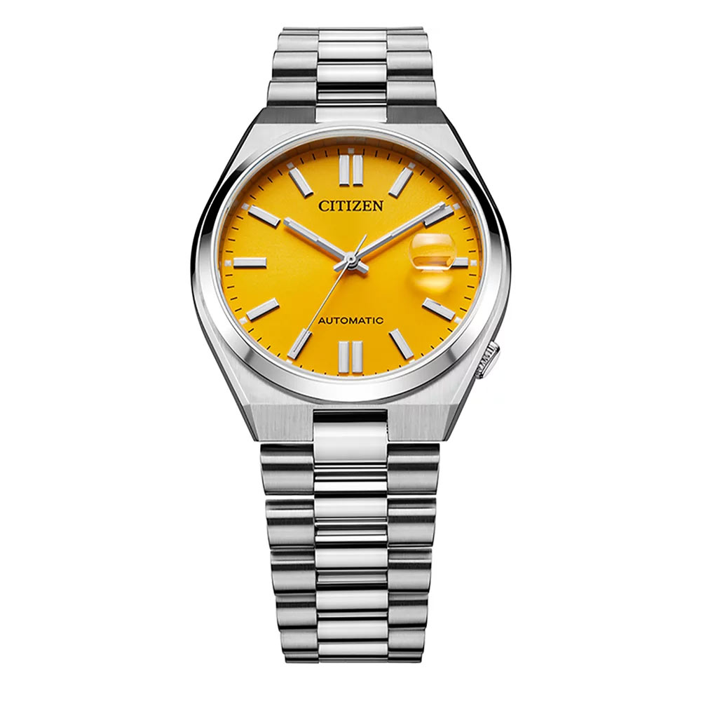 Pod antyrefleksyjnym szafirowym szkłem, ten męski zegarek posiada żółtą tarczę. Na tarczy widać datownik powiększany przez lupę na godzinie 3 oraz kontrastujące srebrnymi detalami wskazówki i indeksy, które dodają mu klasycznej estetyki. Na wskazaniach znajduje się świecąca w ciemności masa luminescencyjna, która ułatwi odczytanie godziny. Ten automatyczny zegarek Citizen wyposażony jest w japoński mechanizm Kaliber 8210, który oferuje rezerwę chodu do 42 godzin. Sprawdzony, precyzyjny układ chwali się skomplikowaną konstrukcją oraz pozłacanymi elementami. Zegarek męski Citizen na bransolecie to doskonały wybór dodatku na każdą okazję. Dopasuje się do koszuli eleganckiej, jak i sportowej. Będzie on kompletnym uzupełnieniem męskiej garderoby.