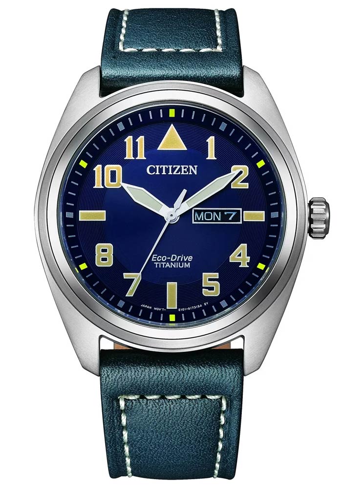 Citizen Military BM8560-45LC wojskowy zegarek w wersji tytanowej. Niezwykle lekki, przyjemny w noszeniu i hipoalergiczny materiał Super Titanium użyty w tym czasomierzu zapewnia niezrównany komfort noszenia. Surowe, matowe wykończenie koperty oraz skórzany pasek w kolorze niebieskim z białym szyciem dodaje outdoorowego charakteru. Niebieska tarcza z żółtymi, sportowymi akcentami, arabskie indeksy i wskazówki wypełnione substancją luminescencyjną w kolorze Old Radium. Całość przykryta jest odpornym na zarysowania szkłem szafirowym. Citizen Military wyposażony jest w mechanizm Eco-Drive zasilany dowolnym źródłem światła. Takie rozwiązanie jest niezwykle przydatne. Nie ma potrzeby wymiany baterii co 2 lata, akumulator w mechanizmie magazynuje energię potrzebną do działania zegarka. Kolejną przydatną funkcją jest datownik rozbudowany o nazwę dnia tygodnia.