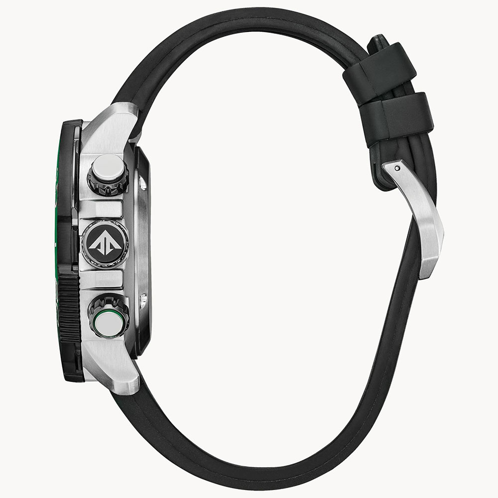 Kultowa kolekcja Citizen Aqualand odznacza się niebanalną stylistyką. Duża koperta o średnicy 47 mm i wysokości 15,90 mm z dużym i czytelnym obracającym się pierścieniem nurkowym. Oznaczony kolorem czarnym i zielonym dla lepszej czytelności, co jest niezmiernie ważne podczas nurkowania. Wodoodporny pasek gumowy w kolorze czarnym z napisem PROMASTER dodatkowo z przedłużka na skafander. Na godzinie dziewiątej Citizen umieścił czujnik nurkowy, który dostarcza informacji na temat pamięci maksymalnej głębokości, alarm szybkiego wynurzenia i automatyczny tryb nurkowania. Aqualand zapewnia wodoszczelność na poziomie 20 barów 200 m dzięki zastosowaniu zakręcanych przycisków i zakręcanej koronki. Citizen Promaster Aqualand został wykonany zgodnie ze standardem ISO6425 dla zegarków nurkowych.
