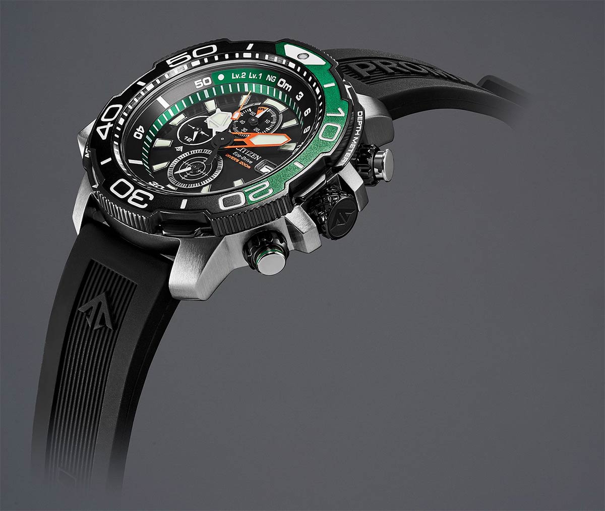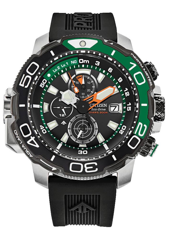 Citizen Promaster Marine Aqualand Chronograph Sensor Diver 200 m BJ2168-01E stworzony dla profesjonalnych poszukiwaczy podwodnych przygód. Zegarek nurkowy pełen funkcjonalności, trwałości i bezpieczeństwa z technologią Eco-Drive — solarny mechanizm zasilany dowolnym źródłem światła.