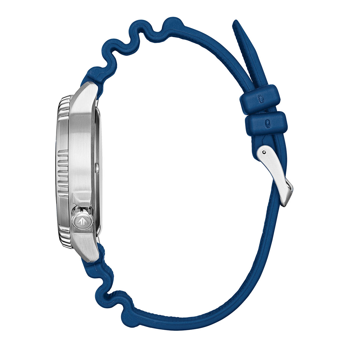 Profesjonalny zegarek nurkowy Citizen BN0168-06L z kolekcji zegarków PROMASTER MARINE. Czasomierz jest wykonany zgodnie z wytycznymi ISO 6425 dla zegarków nurkowych i zawiera szereg rozwiązań przydatnych pod wodą. Specjalny kształt koperty ze stali szlachetnej o średnicy 44 mm, obracająca się w jednym kierunku dwu kolorowa ramka nurkowa ze specjalnymi wycięciami, które ułatwiają obracanie jej w rękawicach. Zakręcany dekiel i koronka umiejscowiona na godzinie czwartej, w ten sposób nie dotyka ona nadgarstka i nie ma ryzyka, że odkręci się podczas schodzenia pod wodę. Gumowy pasek o specjalnym kształcie zapewnia swobodny przepływ wody przez nadgarstek i nie przeszkadza podczas nurkowania. Bardzo gruba warstwa substancji luminescencyjnej na wskazówkach i indeksach zapewnia widoczność w ciemności i pod wodą. Niezawodny mechanizm solarny Eco-Drive.