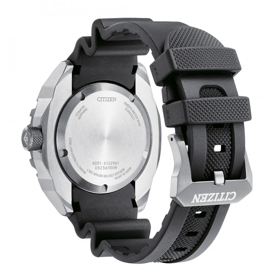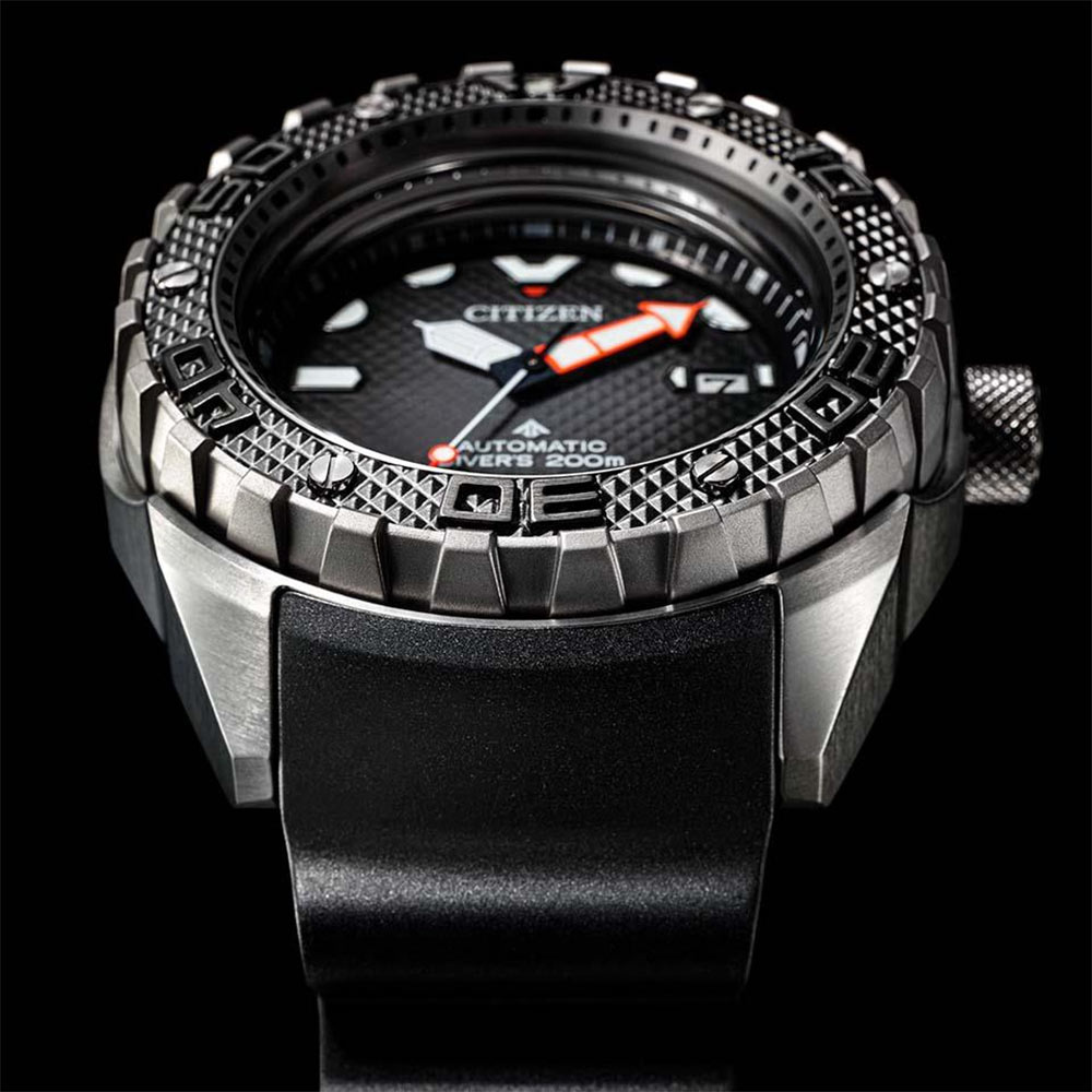 Odważne trapezowe wgłębienia wokół krawędzi obudowy są zarówno stylowe, jak i funkcjonalne, zapewniając wytrzymały wygląd i pewny chwyt podczas korzystania z ramki nurkowej. Koperta ma dwuczęściową strukturę i wykorzystuje technologię Super Titanium™ z zastrzeżoną technologią utwardzania powierzchni Duratect firmy CITIZEN, dzięki czemu zegarek jest niezwykle lekki jak na swój rozmiar. Wytrzymały wygląd tego modelu jest wzmocniony przez misterny, przypominający ćwieki wzór piramidy na ramce i tarczy z odcieniami, które zmieniają się w zależności od kąta patrzenia.