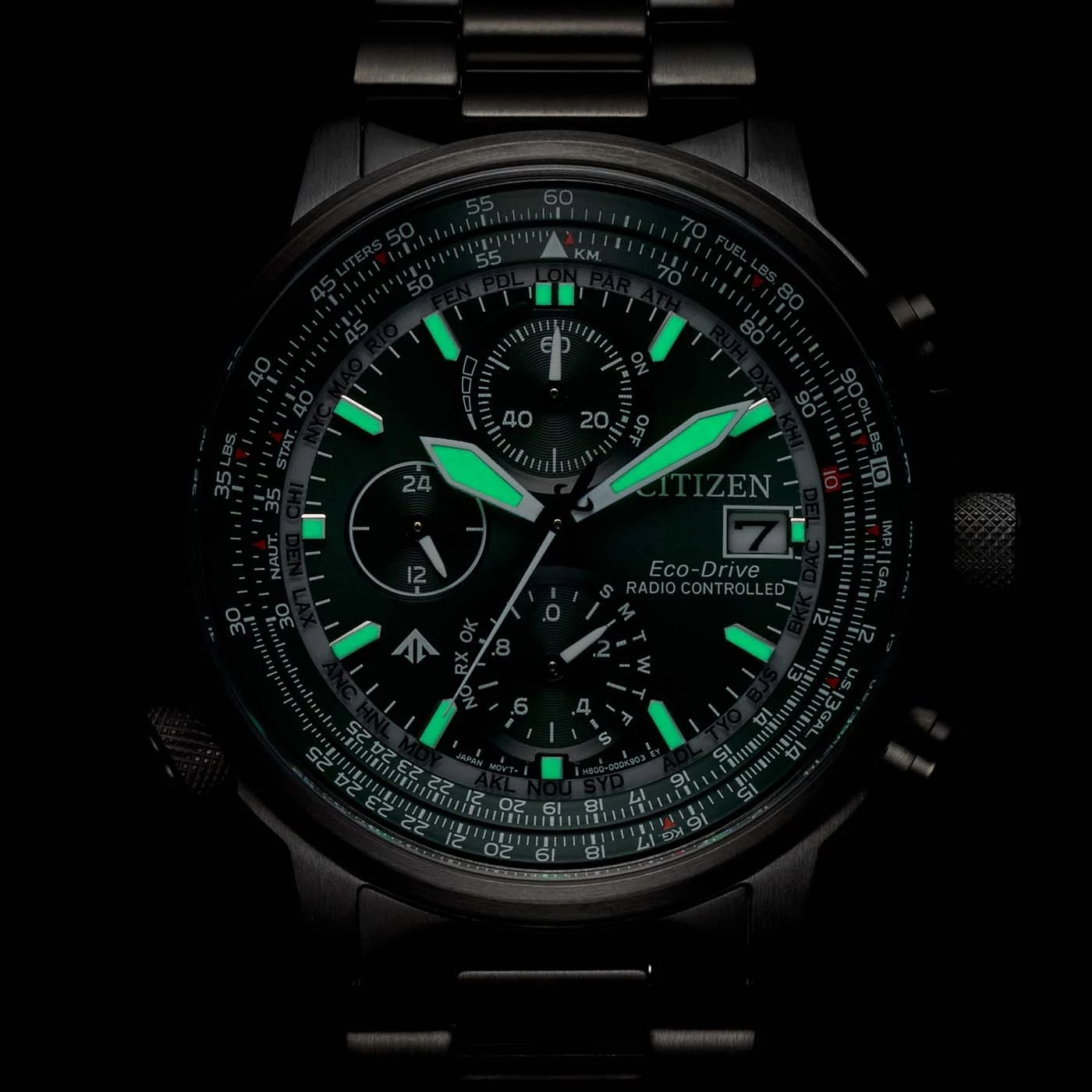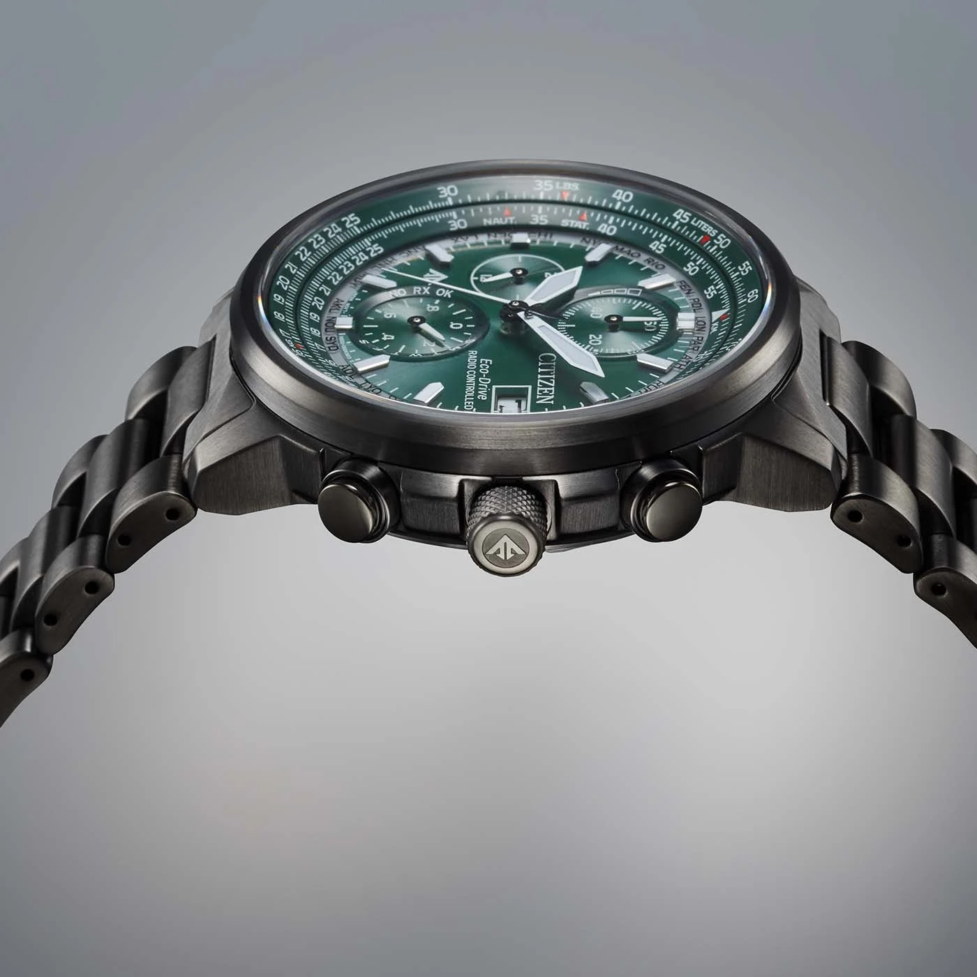 Citizen Promaster Sky AT8304-57W to zegarek, który wyróżnia się nie tylko technologią, ale także odważnym i nowoczesnym designem. Zielona tarcza w głębokim odcieniu doskonale kontrastuje z kopertą i bransoletą w kolorze Gun – ciemnoszarej, niemal czarnej powłoce o wyjątkowej twardości i odporności na zarysowania. To połączenie sprawia, że zegarek nabiera sportowej elegancji i podkreśla swój lotniczy charakter.