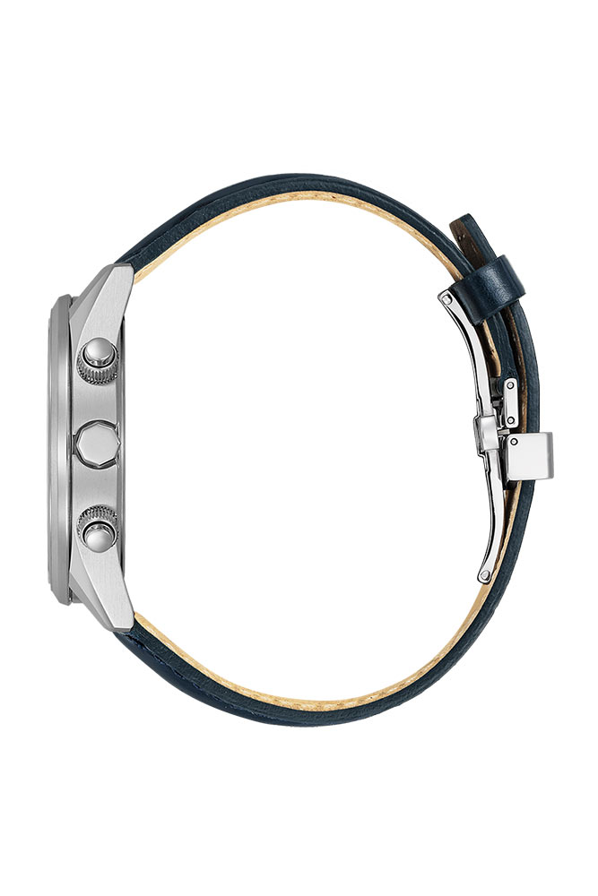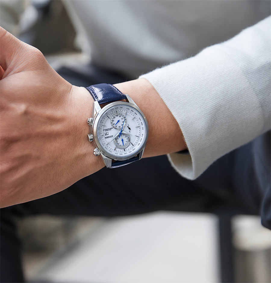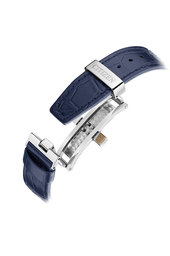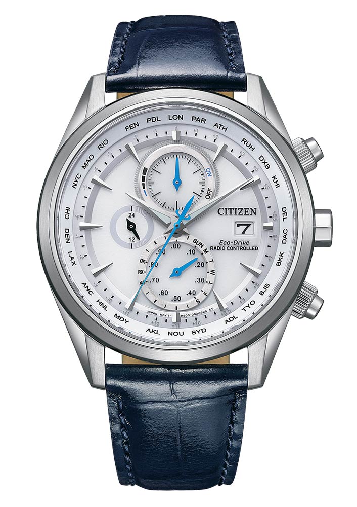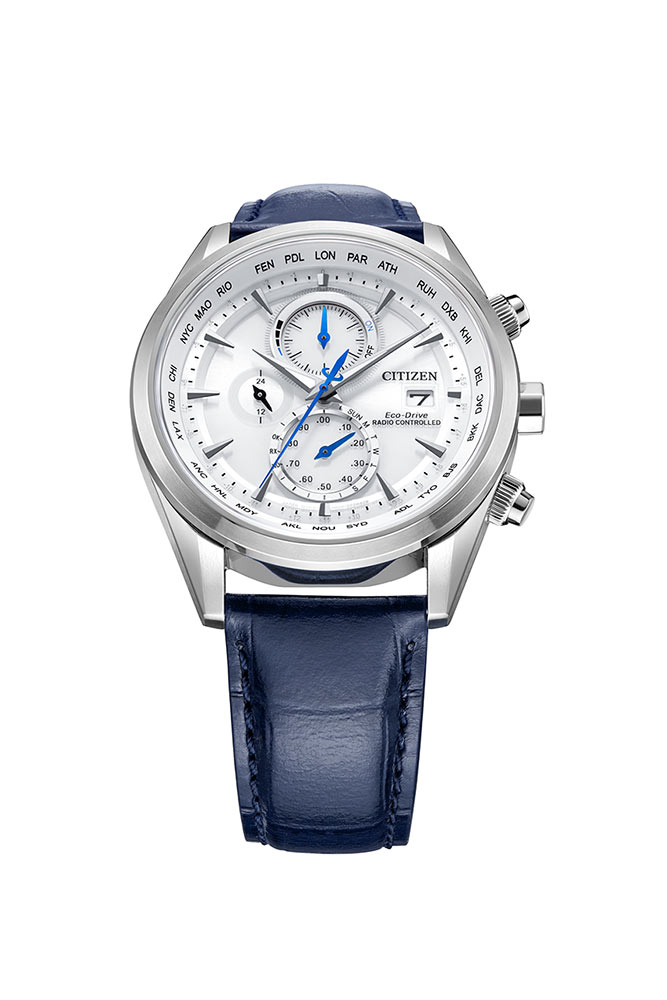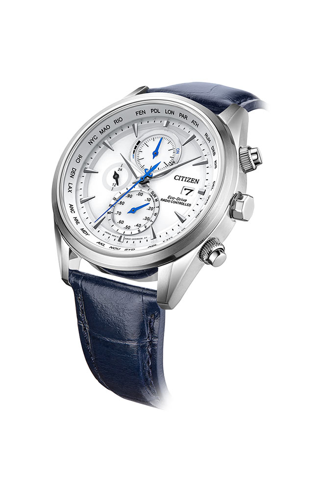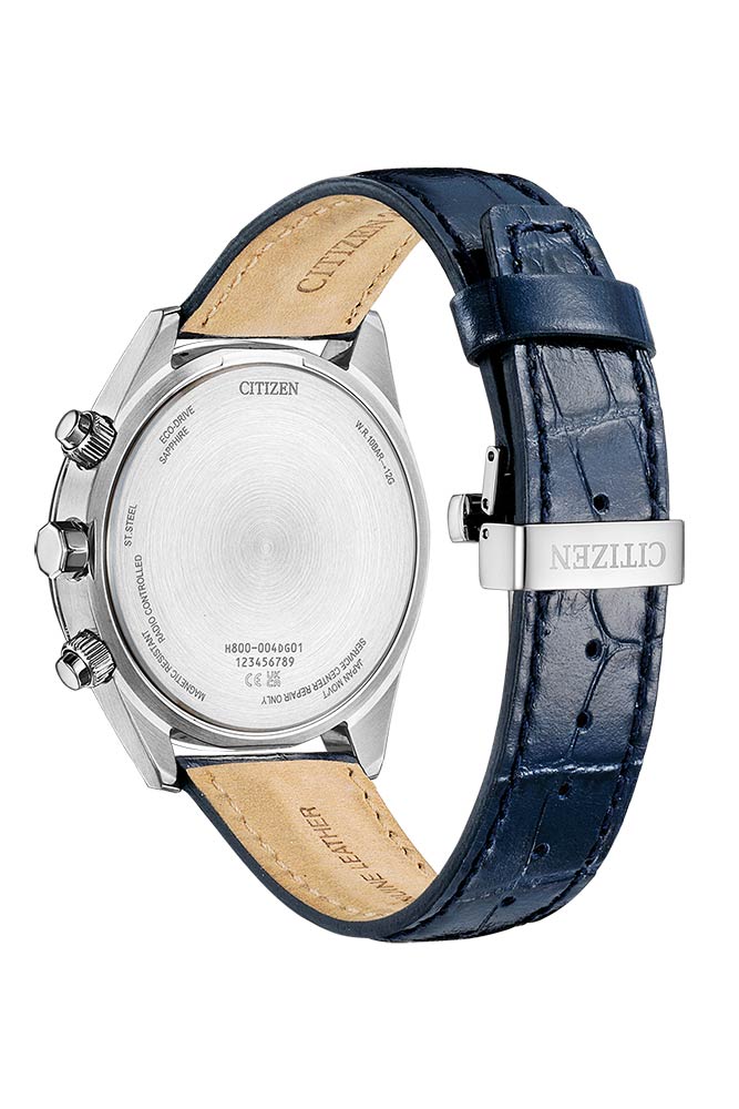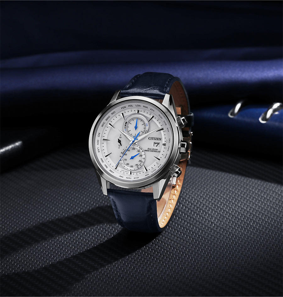 Męski zegarek Citizen Radio Controlled Chronograph to okrągła obudowa wykonana z odpornej na korozje stali szlachetnej klasy 316L. Stal szlachetną charakteryzuje wyjątkowa trwałość i odporność na czynniki zewnętrzne, dzięki czemu jest to idealny wybór do codziennego użytku. Po prawej stronie obudowy tradycyjnie umieszczone zostały przyciski funkcyjne i koronka. Zegarek z chronografem Citizen Radio Controlled w rozmiarze 43 mm zestawiony został z miękkim, wygodnym i eleganckim paskiem ze skóry naturalnej w kolorze niebieskim. Pasek w bezpieczny sposób otuli nadgarstek, a zagwarantuje to zapięcie motylkowe na dwa przyciski.