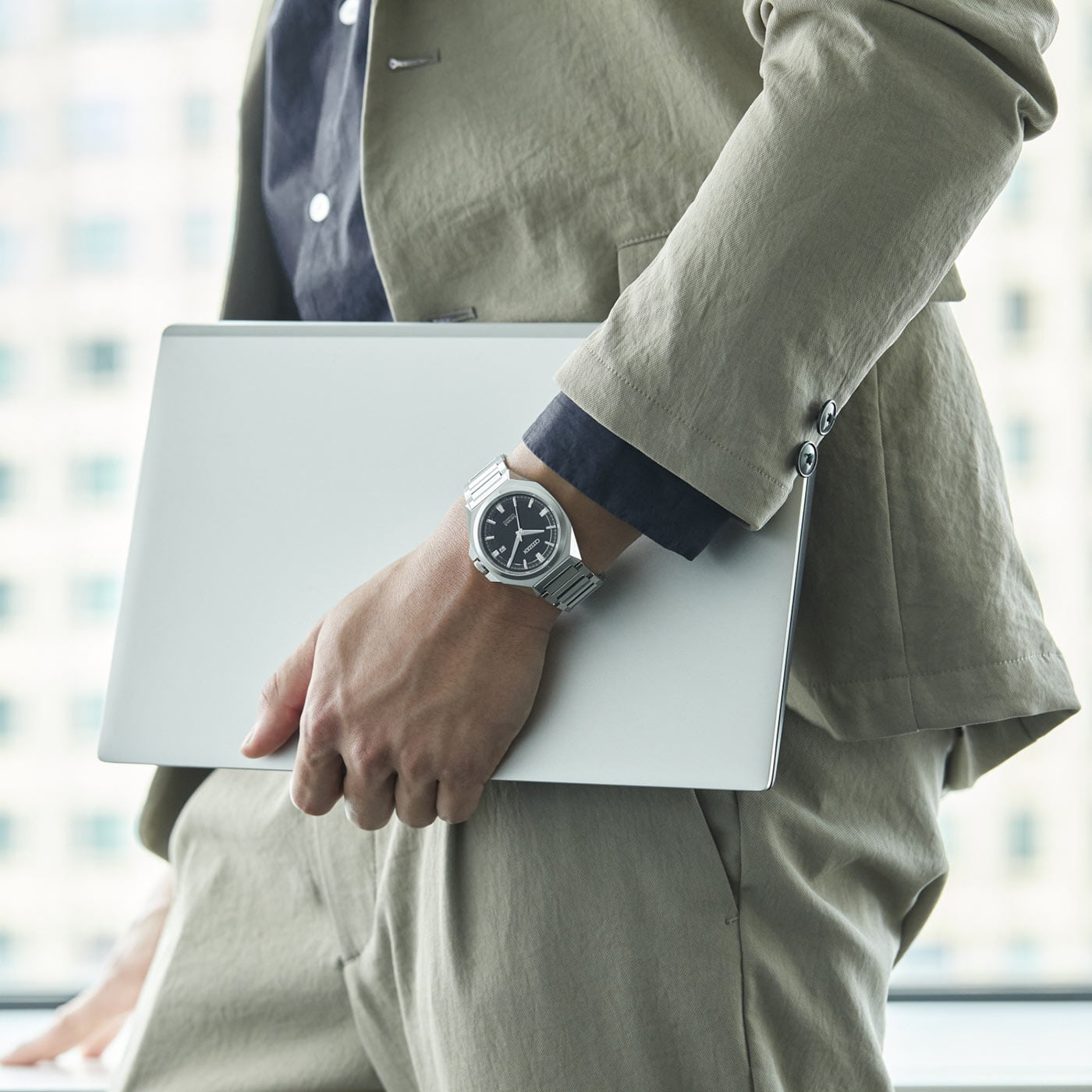 Prosta, czytelna i efektownie matowa powierzchnia tarczy jest doskonale zorganizowana ze znacznikami minut, co podkreśla mechaniczny charakter dzieła. Głęboko osadzona w kopercie emanuje swobodnym i miejskim wyrafinowaniem, tworząc czasomierz o silnym charakterze i absolutnej czytelności, co jest charakterystyczne dla Series 8. Bransoleta, złożona z prostych linii i płaskich powierzchni, nie tylko zapewnia praktyczną wygodę dla nadgarstków, ale także wyróżnia się oszczędnym, strukturalnym pięknem. Jej geometryczne linie nadają temu srebrnemu zegarkowi męskiemu ponadczasową prostotę, podkreślając jego elegancję i trwałość.