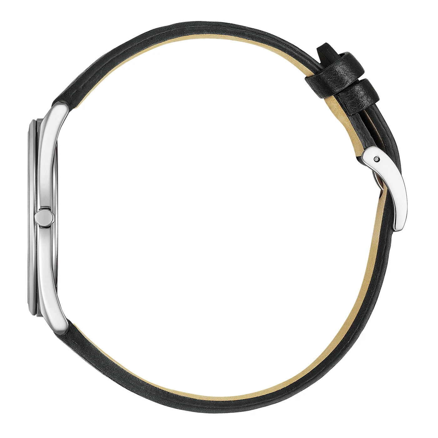 Koperta o średnicy 38,40 mm została wykonana ze stali szlachetnej i zestawiona z czarnym paskiem skórzanym o subtelnej fakturze, który nadaje zegarkowi klasy i komfortu noszenia. Srebrna tarcza zdobiona pionową strukturą szczotkowania podkreśla minimalistyczny charakter całości, a delikatne indeksy i arabskie cyfry na godzinie 12 i 6 tworzą przejrzysty, elegancki układ. Całość chroni odporne na zarysowania szkło szafirowe, gwarantujące doskonałą czytelność przez lata użytkowania.