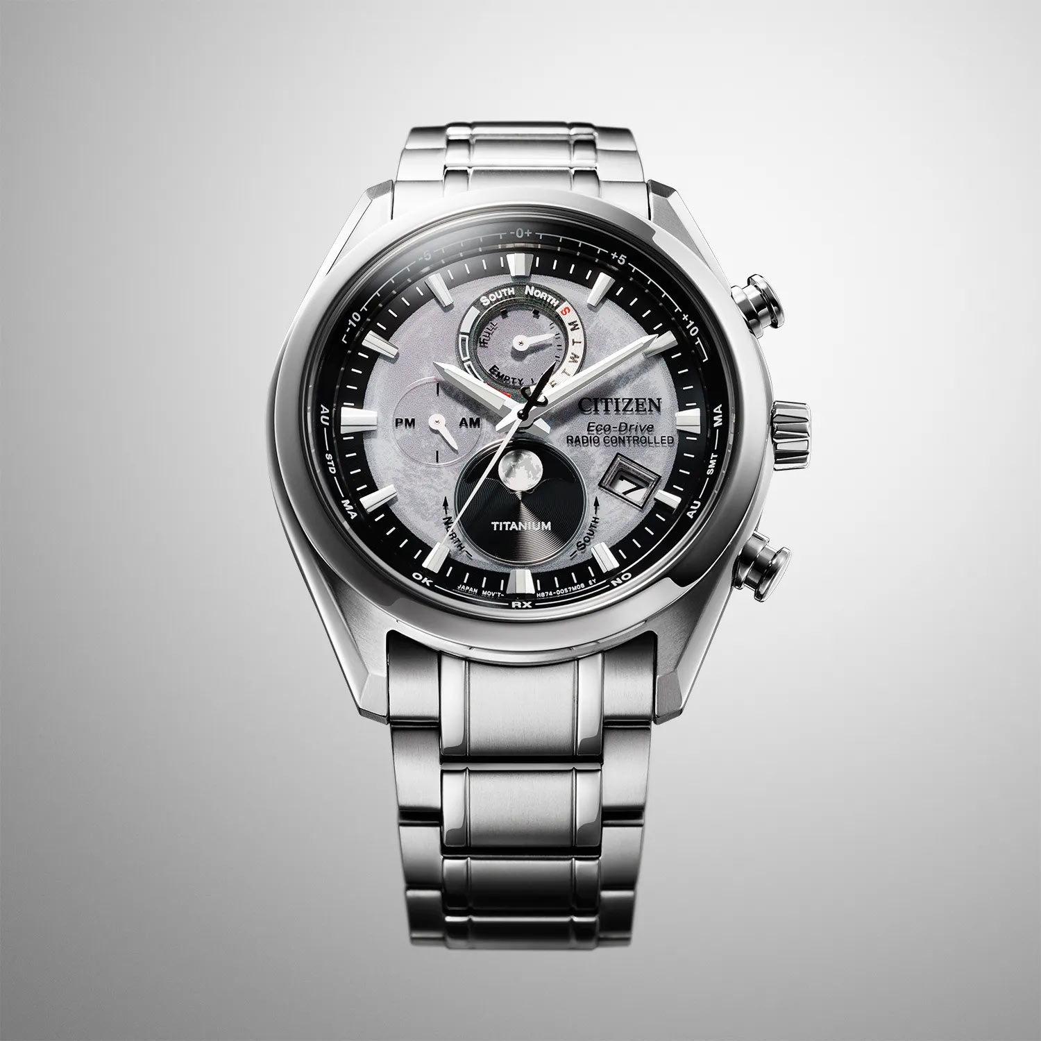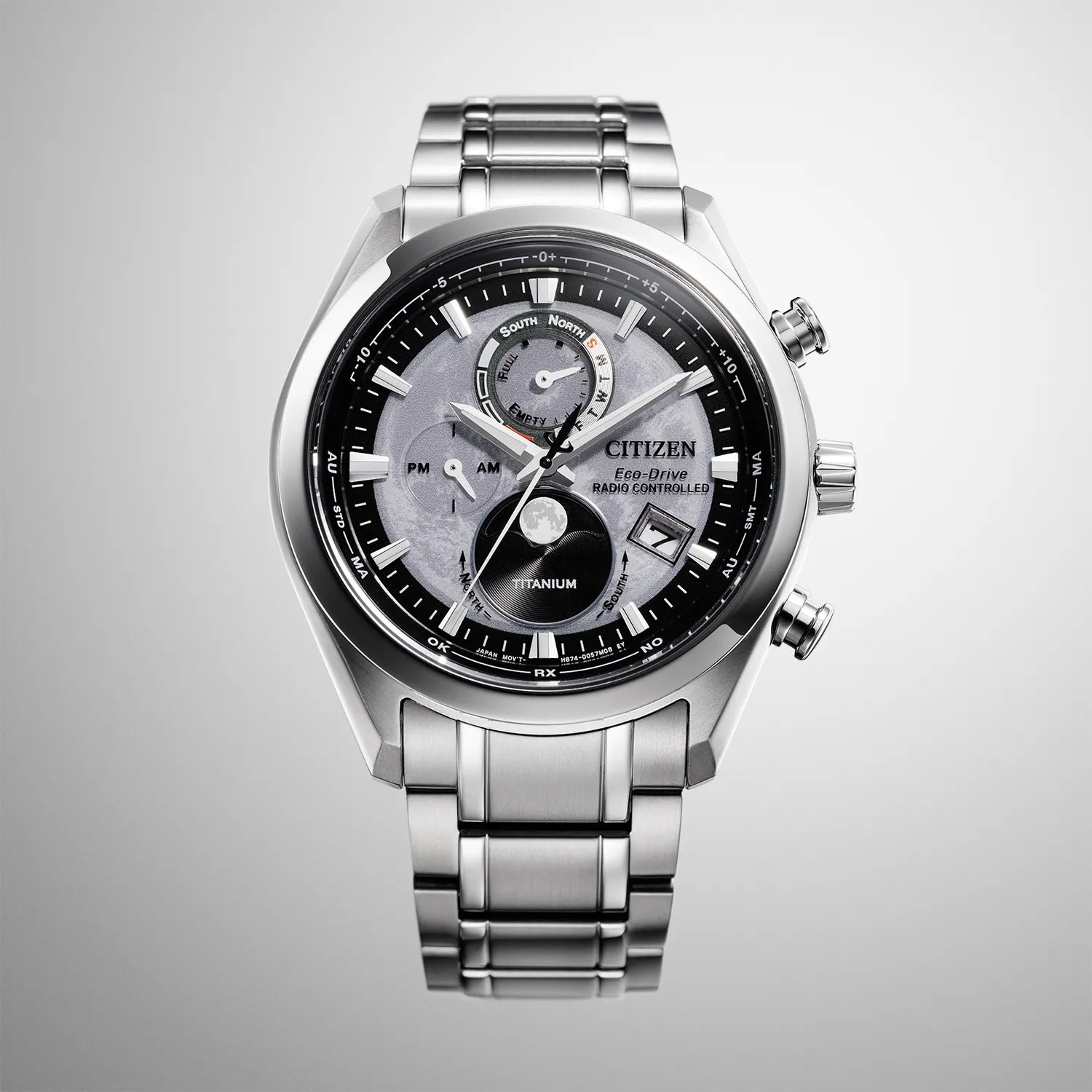 Męski zegarek Citizen Tsukiyomi Moonphase Titanium Radio Controlled BY101081H to okrągła obudowa wykonana z tytanu, który jest niezwykle lekki i odporny na korozje. Zegarek oferowany jest w rozmiarze 43-milimetrów w zestawieniu z bransoletą tytanową z bezpiecznym i wygodnym zapięciem motylkowym. Po prawej stronie obudowy swoje miejsce otrzymały przyciski funkcyjne i koronka. Rewers to tytanowy dekiel, który uszczelnia całą konstrukcję. W środku obudowy umieszczony został mechanizm solarny Citizen Eco-Drive, który napędzany jest dowolnym źródłem światła. Mechanizmy Eco-Drive nie wymagają wymiany baterii, co stanowi ważny element walki o ekologię. Zegarek męski Citizen Tsukiyomi Moonphase BY1010-81H to pierwszy zegarek na świecie, którego funkcja fazy księżyca kontrolowana jest automatycznie. Zegarek Citizen Radio Controlled posiada bardzo dokładny czas sterowany radiowo. Pobiera on sygnał czasu z zegara atomowego z dokładnością +-1 s.