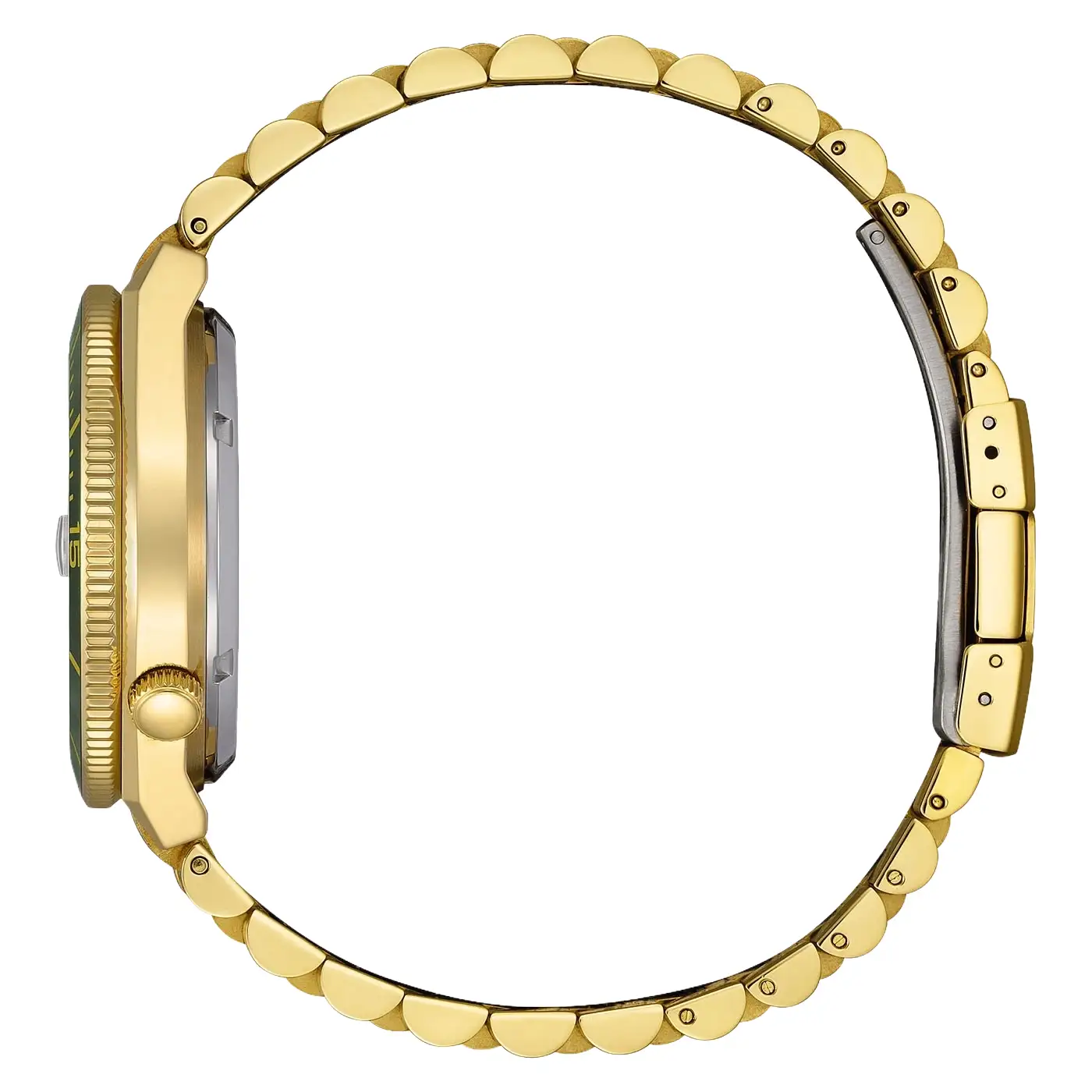 Citizen Tsuyosa Shore NJ0232-53X to najbardziej prestiżowa odsłona nowej, sportowej linii automatów, która łączy w sobie odważną kolorystykę z luksusowym wykończeniem. Cała konstrukcja, obejmująca kopertę oraz bransoletę, została pokryta trwałą powłoką w kolorze żółtego złota. Centralnym punktem projektu jest tarcza w głębokim odcieniu zieleni Moss Green z szlifem słonecznym, która w zestawieniu ze złotą oprawą tworzy niezwykle szlachetną i modną kompozycję.