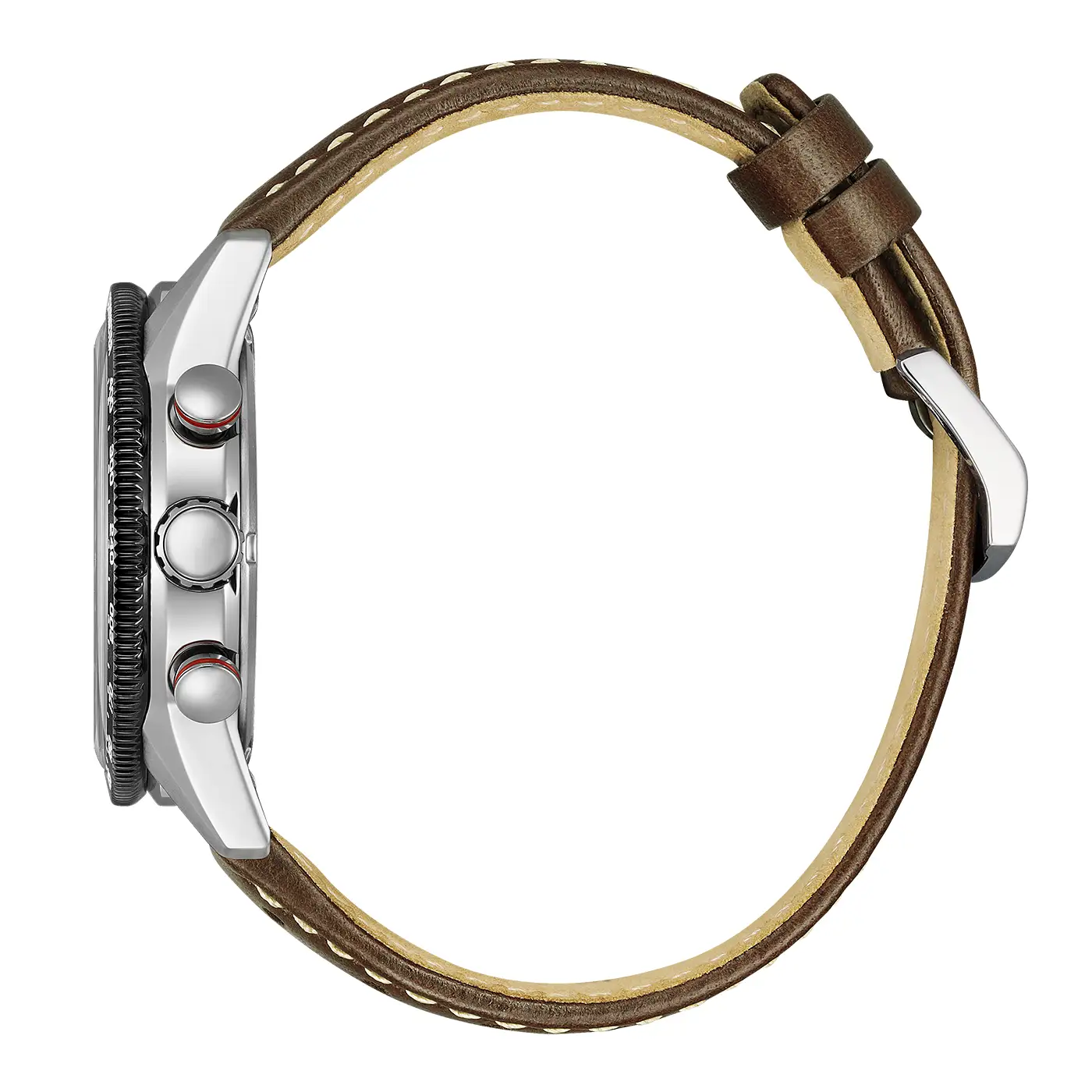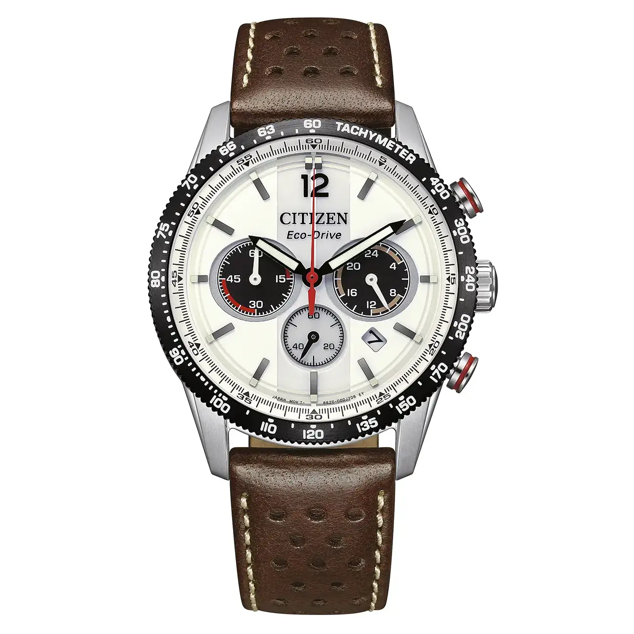 Citizen Vintage Racing Chrono CA4714-04A to zegarek, który w unikalny sposób interpretuje stylistykę retro, łącząc jasną kolorystykę z motoryzacyjnym zacięciem. Projekt tarczy w kolorze kości słoniowej wyróżnia się charakterystycznym pionowym pasem biegnącym przez środek cyferblatu, co nadaje mu dynamicznego, wyścigowego charakteru. Dzięki kontrastującym, ciemnym totalizatorom chronografu, model ten zyskuje klasyczny wygląd typu panda, który jest niezwykle ceniony przez miłośników stylu vintage.