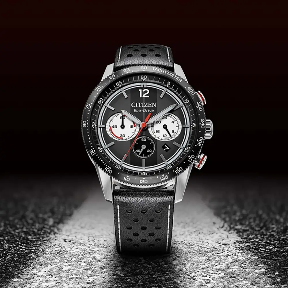 Citizen Vintage Racing Chrono CA4717-06E to czasomierz, który przenosi dynamikę torów wyścigowych prosto na męski nadgarstek. Projekt tarczy wyróżnia się charakterystycznym dla tej serii pionowym pasem przechodzącym przez jej centrum, co stanowi bezpośrednie nawiązanie do malowania klasycznych samochodów typu muscle car. Ten unikalny detal teksturalny sprawia, że czarna tarcza panda nabiera głębi i staje się bardziej techniczna, doskonale współgrając z kontrastującymi białymi totalizatorami chronografu.