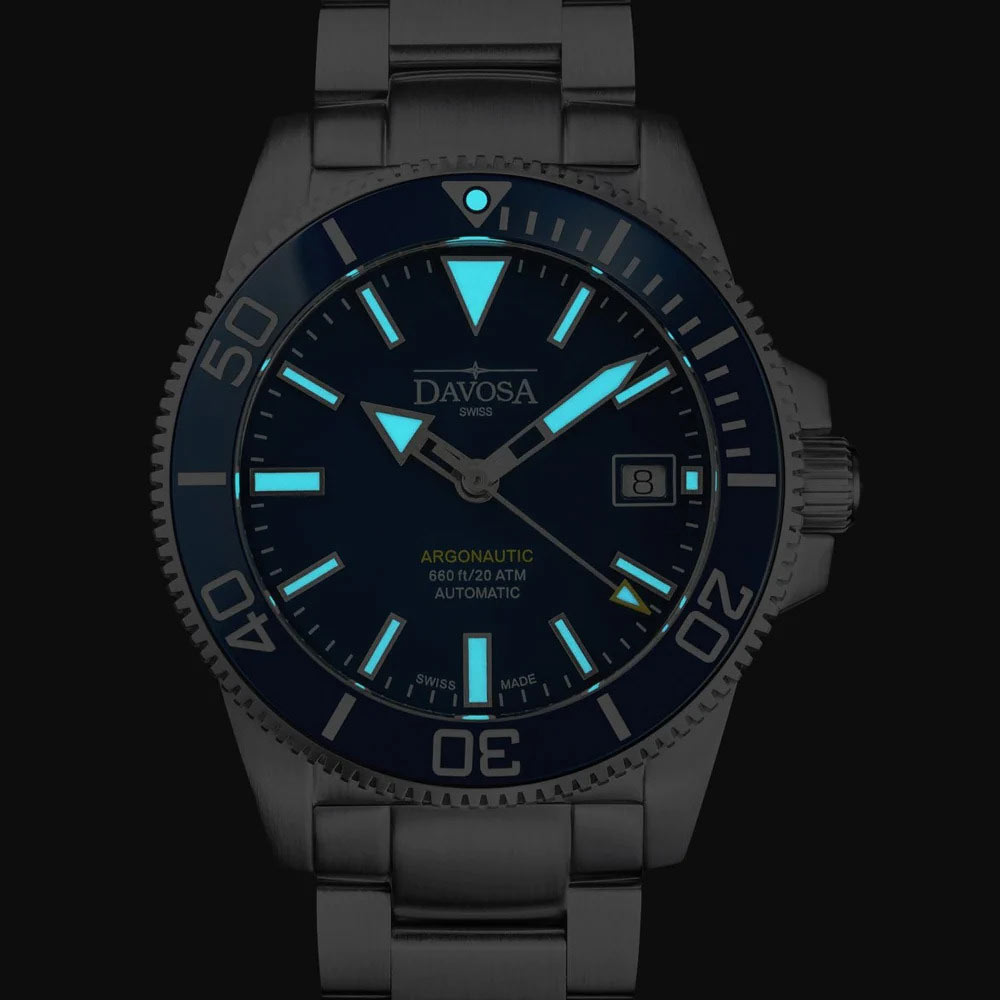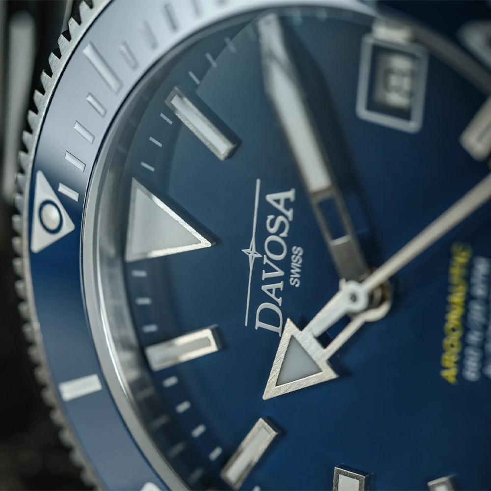 Twarde i wysoce odporne na zarysowania szkło szafirowe osłania tarczę w kolorze niebieskim. Czas wskazują duże wskazówki i czytelne indeksy na pełnych punktach godzinowych. Marka Davosa dbając o doskonałą czytelność tarczy, wypełniła wskazówki i indeksy szwajcarską masą luminescencyjną Super-LumiNova® BGW9. Świeci ona bardzo jasnym światłem, co zagwarantuje odczyt w każdych warunkach oświetleniowych. Na godzinie trzeciej swoje miejsce otrzymał datownik. Okno z jasnym tłem wskazuje aktualny dzień miesiąca. Projekt tarczy pozwala na natychmiastowe odczytanie godziny już po pierwszym spojrzeniu.