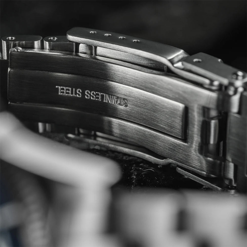 Męski zegarek Davosa Argonautic 39 161.532.40 to okrągła obudowa ze stali szlachetnej 316L w kolorze srebrnym. Czasomierz w rozmiarze 39.50 mm odporny jest na wodę do głębokości 200 metrów. Można z nim nurkować bez obawy o uszkodzenie mechanizmu. W środku koperty zainstalowany został automatyczny werk szwajcarski, który napędzany jest ruchem nadgarstka. Ważnym zabezpieczeniem całej konstrukcji jest zakręcana koronka oraz dekiel. Na froncie koperty nałożony został obrotowy bezel ze skalą, która pomoże śledzić upływający czas w minutach. Niebieski ring na lunecie wykonany został z wytrzymałej ceramiki. Producent swój produkt zestawił z solidną bransoletą z zapięciem motylkowym. W bezpieczny sposób oplecie ona nadgarstek i zagwarantuje komfort w czasie użytkowania tego modelu.