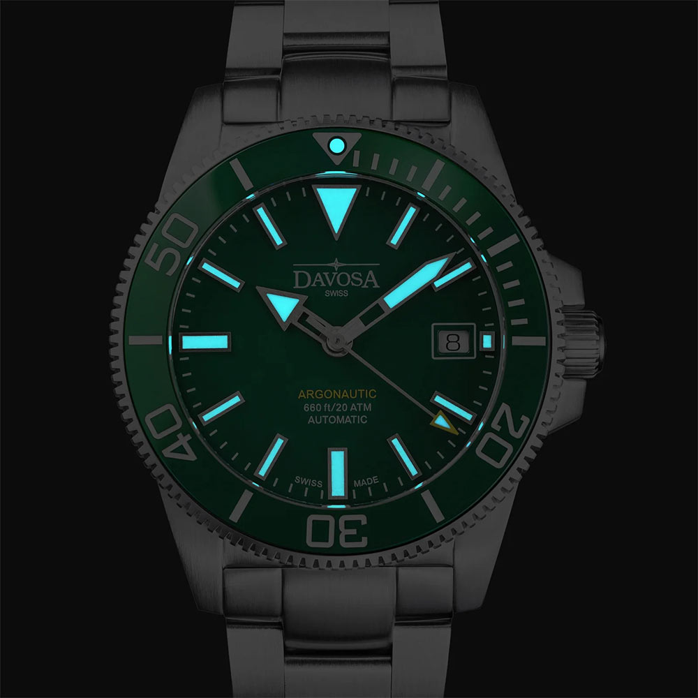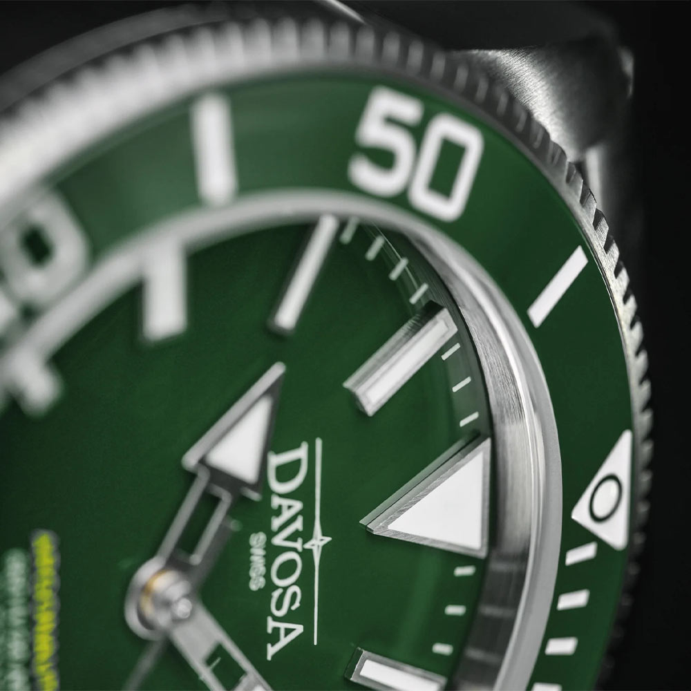 Twarde i wysoce odporne na zarysowania szkło szafirowe osłania tarczę w kolorze butelkowej zieleni. Czas wskazują duże wskazówki i czytelne indeksy na pełnych punktach godzinowych. Marka Davosa dbając o doskonałą czytelność tarczy, wypełniła wskazówki i indeksy szwajcarską masą luminescencyjną Super-LumiNova® BGW9. Świeci ona bardzo jasnym światłem, co zagwarantuje odczyt w każdych warunkach oświetleniowych. Na godzinie trzeciej swoje miejsce otrzymał datownik. Okno z jasnym tłem wskazuje aktualny dzień miesiąca. Projekt tarczy pozwala na natychmiastowe odczytanie godziny już po pierwszym spojrzeniu.