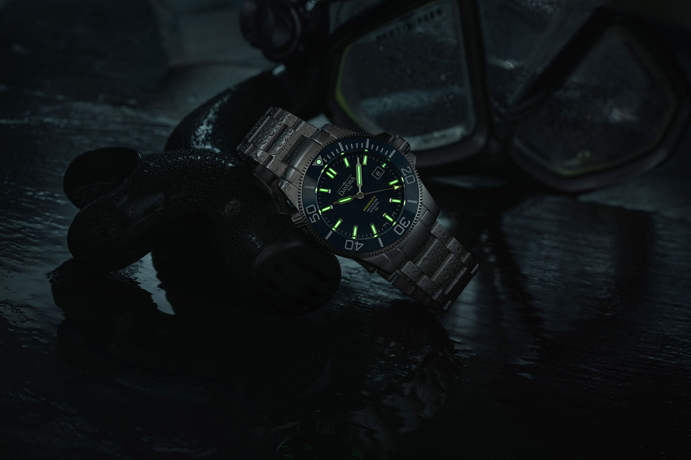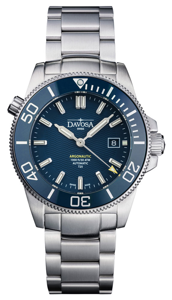 Davosa Argonautic Lumis 161.529.40 automatyczny zegarek nurkowy z podświetleniem trytowym, niebieską tarczą i ceramicznym bezelem.