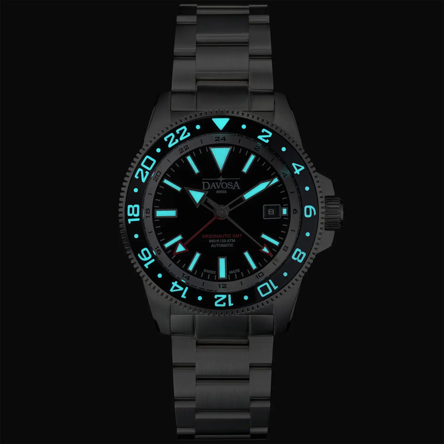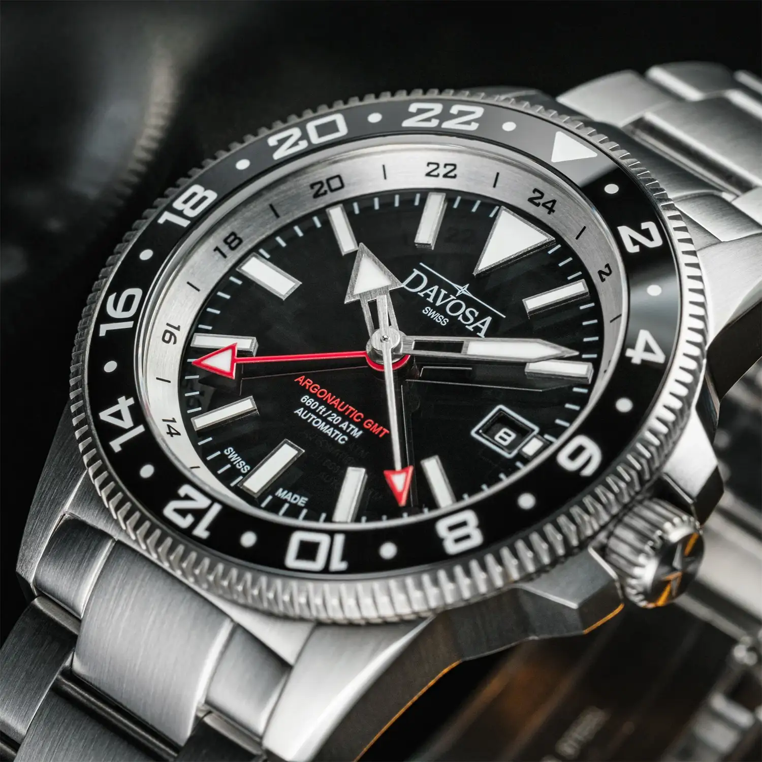 Davosa Argonautic World Traveller 161.542.50 to zegarek męski, który łączy funkcjonalność wskazania dwóch stref czasowych GMT z charakterem profesjonalnego zegarka nurkowego. W tej odsłonie projekt wyróżnia się czarną tarczą i ceramiczną lunetą w odcieniu głębokiej czerni, które podkreślają elegancko-sportową sylwetkę modelu. To zegarek stworzony dla osób aktywnych, podróżujących i wymagających od czasomierza nie tylko stylu, ale także realnej funkcjonalności.