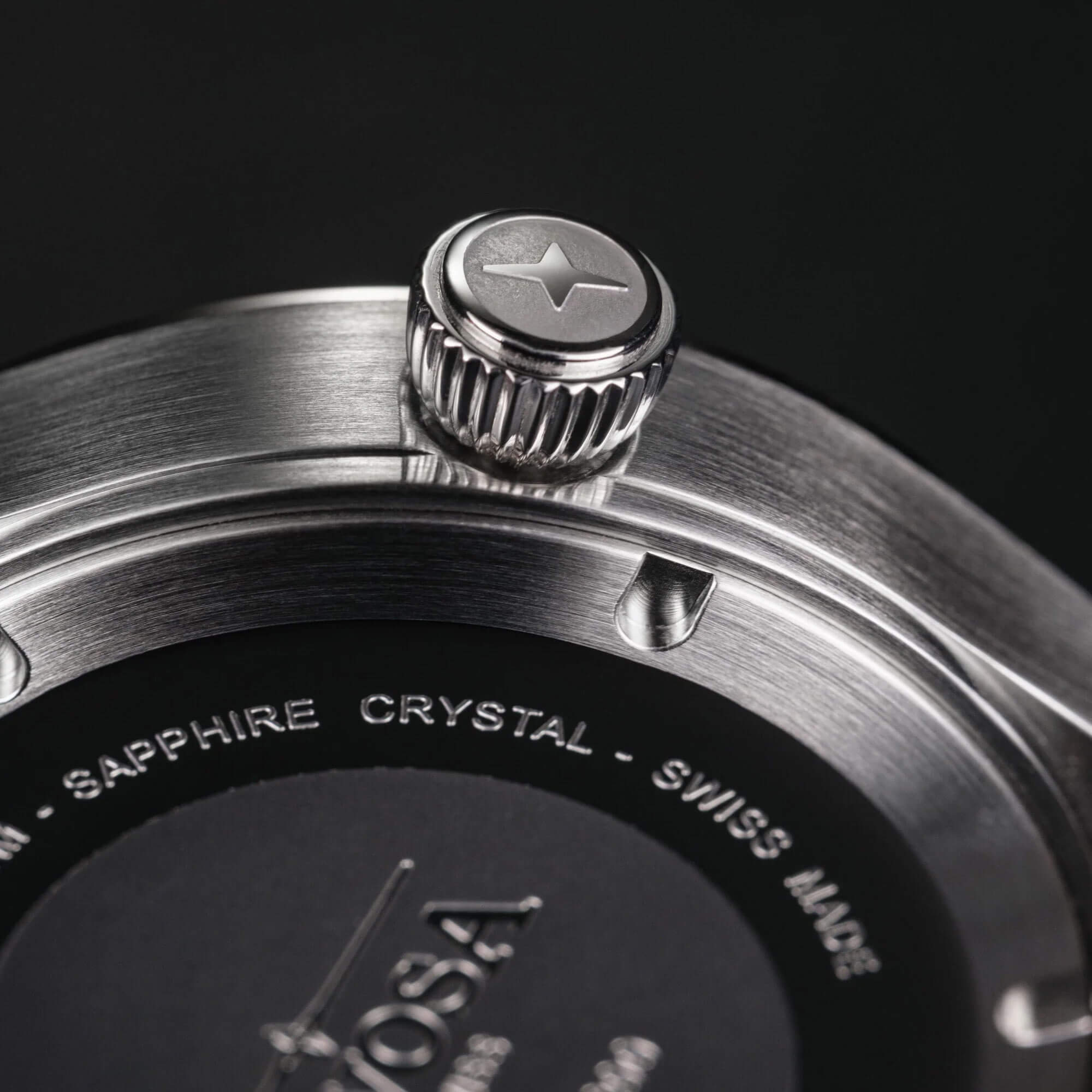 Koperta o średnicy 42 mm wykonana została z odpornej na korozję stali szlachetnej, a jej szczotkowane wykończenie oraz mocno radełkowana koronka z emblematem gwiazdy to znak rozpoznawczy marki Davosa. Zastosowane szkło szafirowe z powłoką antyrefleksyjną chroni przed zarysowaniami, a wodoszczelność do 5 ATM sprawia, że zegarek można bezpiecznie nosić w codziennych warunkach. Wnętrze modelu mieści automatyczny mechanizm DAV3021 (na bazie SW200), którego precyzja i niezawodność potwierdza doświadczenie szwajcarskich zegarmistrzów. Dzięki minimalistycznemu datownikowi i doskonale widocznym wskazaniom Axis Automatic doskonale sprawdza się jako zegarek użytkowy, bez kompromisów w zakresie funkcjonalności.