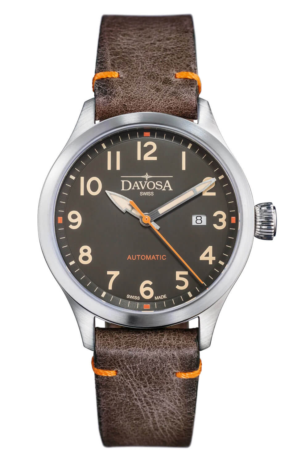 Zegarek męski w stylu lotniczym Davosa Axis 161.574.96 to model zaprojektowany z myślą o użytkownikach, którzy cenią prostotę, solidność i natychmiastową czytelność w każdej sytuacji – w pracy, w drodze, w terenie. Jego design nawiązuje do estetyki klasycznych modeli typu field watch, ale nie jest rekonstrukcją retro – to współczesna interpretacja narzędziowego zegarka codziennego użytku, z subtelnym zacięciem sportowym. Wyraźne cyfry arabskie, pomarańczowy sekundnik i minimalistyczna forma bez zbędnych ozdobników jasno sygnalizują, że to model stworzony do działania. Wskazówki wypełnione są masą Super-LumiNova® C1, która ułatwia odczytanie godziny w słabych warunkach oświetleniowych.