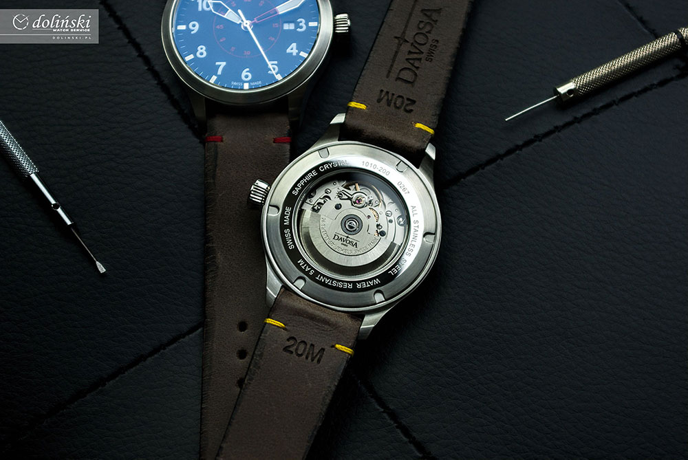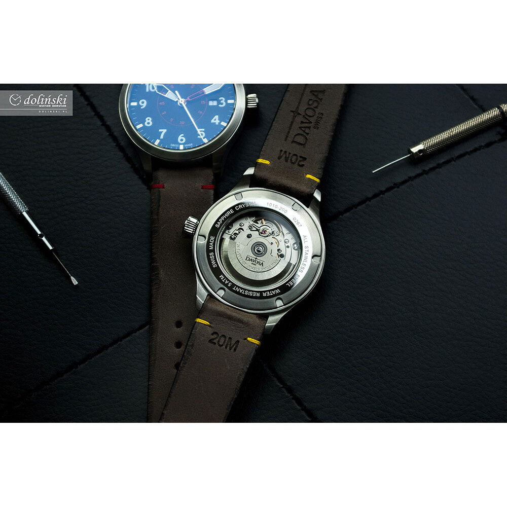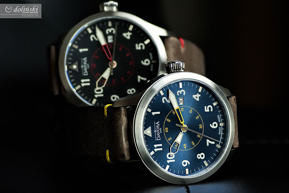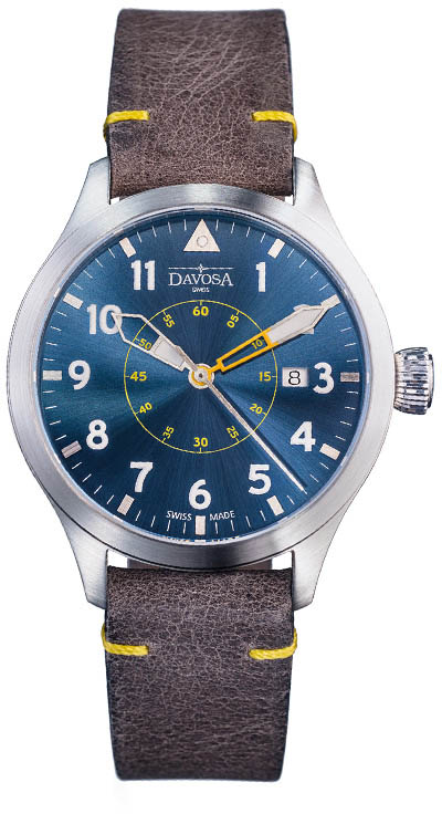Zegarek męski dla miłośników przestworzy, Davosa Neoteric Pilot Automatic. Koperta wykonana ze stali szlachetnej o średnicy 42 mm, ściśle zwarta w niej tacza oraz koronka do ustawiania czasu nadają temu niezwykłemu czasomierzowi niepowtarzalnego stylu, Pilot. Czytelny cyferblat w kolorze niebieskim z arabskimi indeksami posiada w samym centrum żółte indeksy minutowe. Trzy różne wskazówki, w tym wskazówka godzinowa i minutowa są częściowo wycięte. Minutowa wskazówka posiada wycięcie w dolnej części i jest obramowana żółtym kolorem, aby łatwo i szybko można było odczytać minuty. Wskazówka godzinowa posiada wycięcie w górnej części. Vintage-look, skórzany pasek nawiązuje do tradycji zegarków lotniczych.