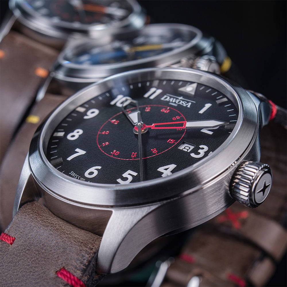 Zegarek męski dla miłośników przestworzy, Davosa Neoteric Pilot Automatic. Koperta wykonana ze stali szlachetnej o średnicy 42 mm, ściśle zwarta w niej tacza oraz koronka do ustawiania czasu nadają temu niezwykłemu czasomierzowi niepowtarzalnego stylu, Pilot. Czytelny cyferblat w kolorze czarnym z arabskimi indeksami posiada w samym centrum czerwone indeksy minutowe. Trzy różne wskazówki, w tym wskazówka godzinowa i minutowa są częściowo wycięte. Minutowa wskazówka posiada wycięcie w dolnej części i jest obramowana czerwonym kolorem aby łatwo i szybko można było odczytać minuty. Wskazówka godzinowa posiada wycięcie w górnej części. Vintage-look, skórzany pasek nawiązuje do tradycji zegarków lotniczych.
