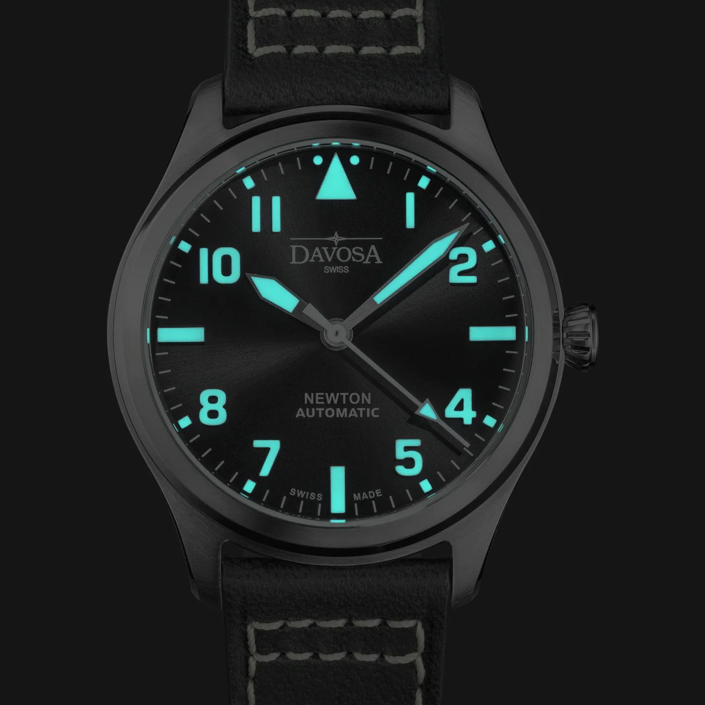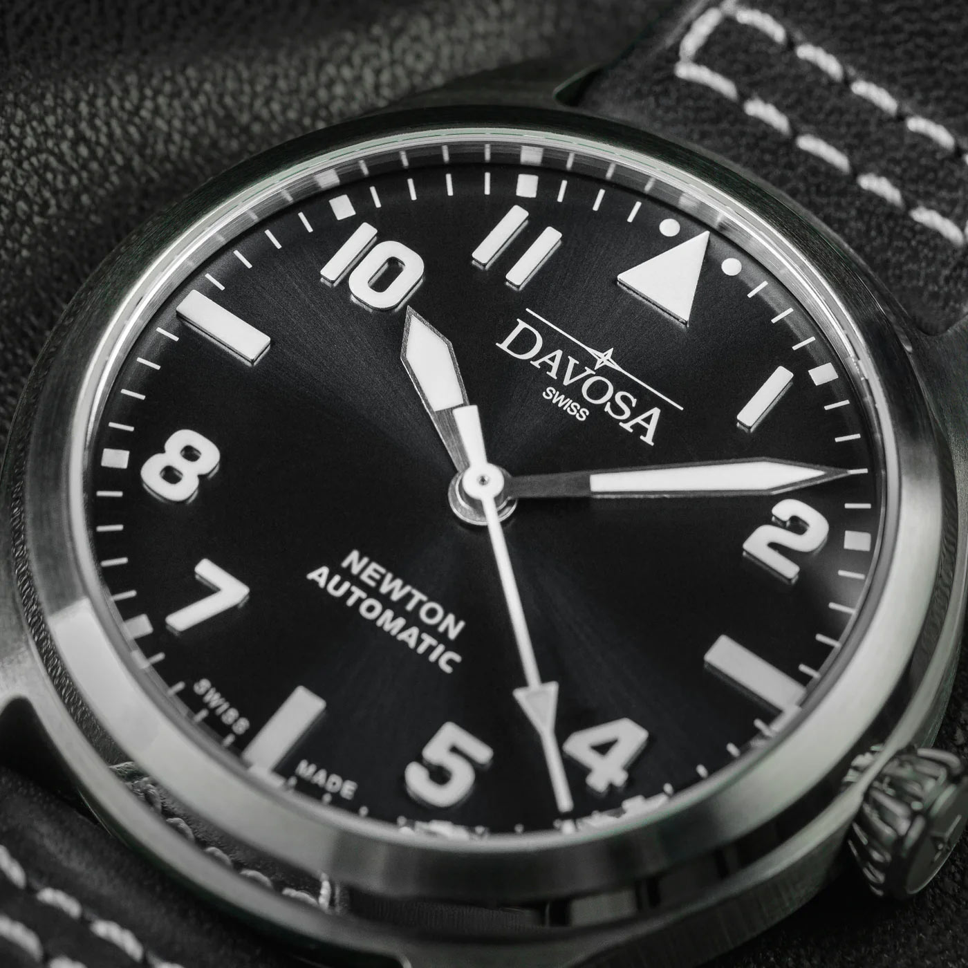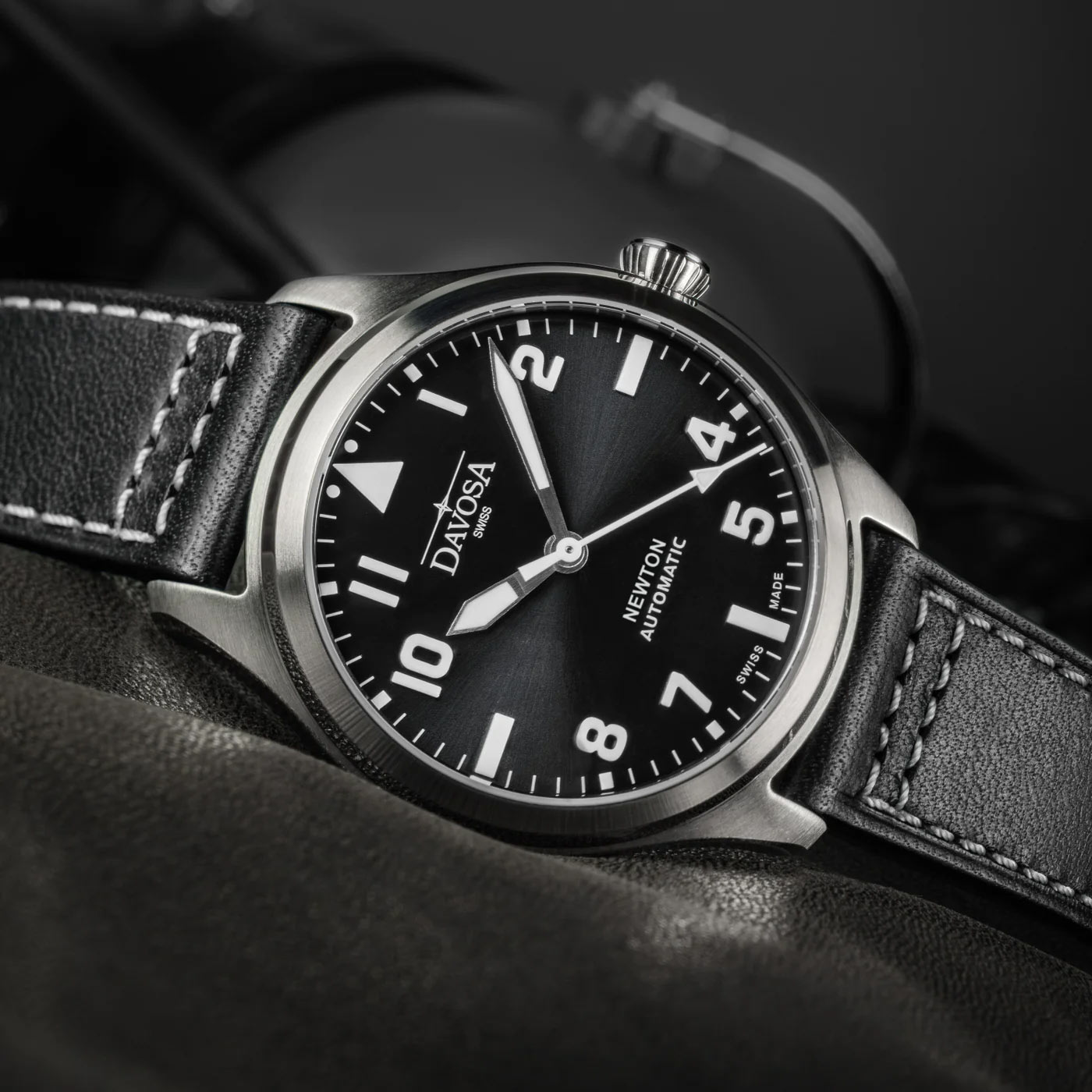 Zegarek męski w stylu lotniczym Davosa Newton Pilot Automatic 161.530.55 zaprojektowany z okazji 120. rocznicy pierwszej próby lotu braci Wright. Czarny wariant z nowej serii Davosa Newton Pilot Automatic opracowanej specjalnie z myślą o wymagających potrzebach lotników. Najświeższa seria dołącza do Newton firmy DAVOSA, poświęconej wynalazcy czasu, Izaakowi Newtonowi.