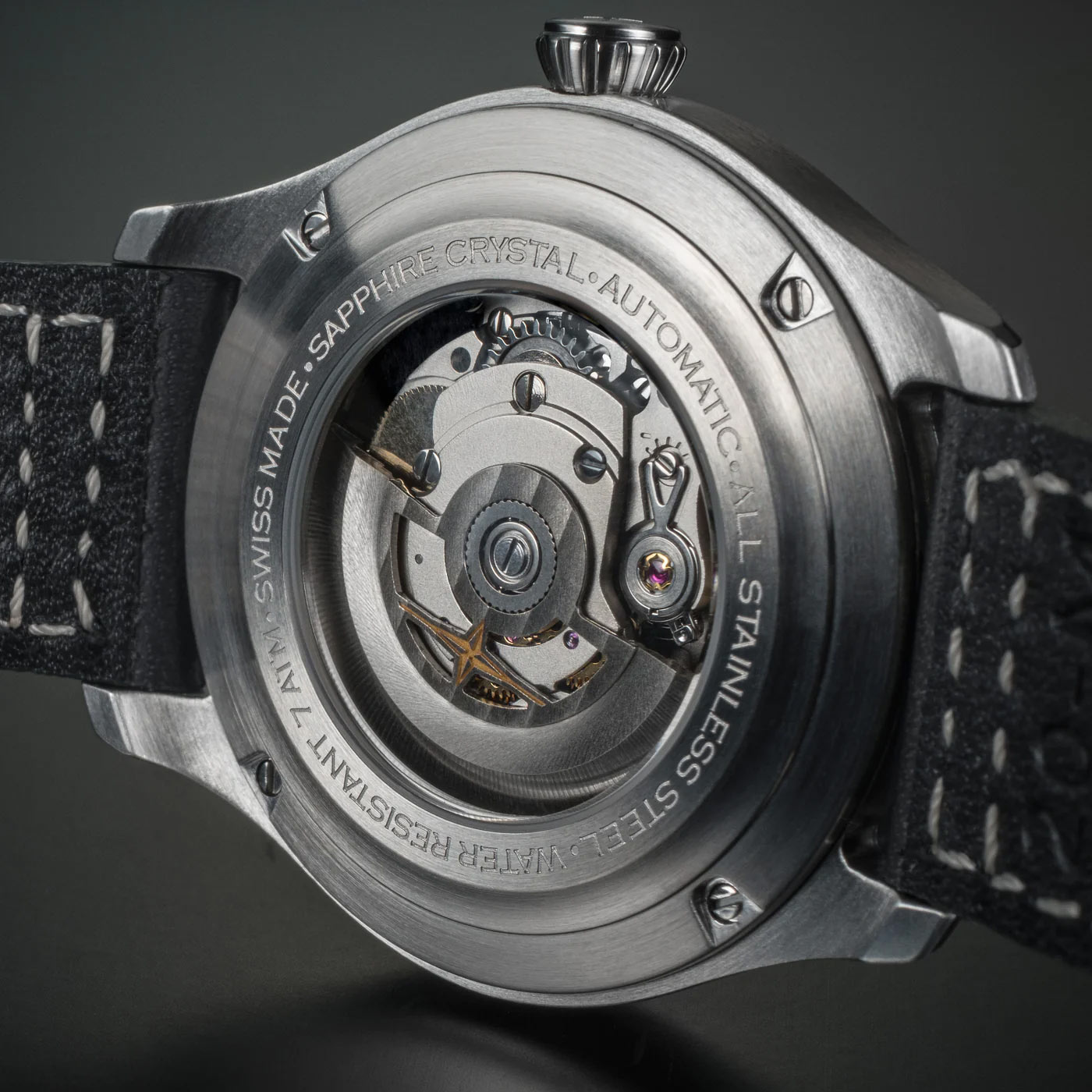 Automatyczny zegarek typu pilot łączy wszystkie znaczące cechy klasycznego zegarka lotniczego z najwyższymi wymaganiami z zakresu jakości produkcji oraz stosowania najnowocześniejszych materiałów. Czasomierz zasila energia kinetyczna generowana przez ruch nadgarstka, który wprawia w ruch szkieletowy wahnik w pasy genewskie, zauważalny przez zakręcany, szklany dekiel. Powstała w ten sposób energia napina sprężynę główną i tworzy rezerwę chodu na około 40 godzin. Zegarmistrzowie z firmy DAVOSA regulowali mechanizm z wyjątkową dokładnością, aby uzyskać odchylenie odpowiadające stopniowi opracowania. Rzetelność i precyzja, na których można polegać.