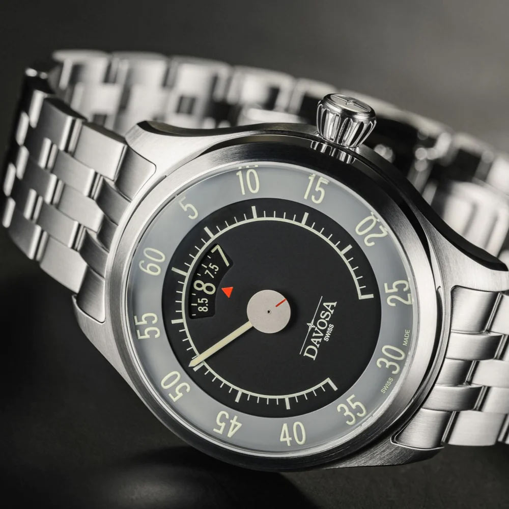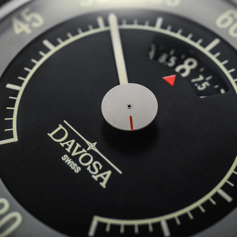 Projektanci marki DAVOSA, podobnie jak ich koledzy z branży motoryzacyjnej lat 50.-60., wykazali się wyjątkową kreatywnością przy tworzeniu tarczy Newton Speedometer. Wskazówkę godzinową zastąpił dysk, który za pomocą czerwonej strzałki w oknie niezawodnie wskazuje aktualną godzinę. Skala indeksowa wskazuje minuty, a mała czerwona kreska sekundy. Ta subtelna kompozycja jest dostępna w neutralnej czerni z białą luminescencją Super-LumiNova® BGW9. W warunkach słabego oświetlenia, dzięki świecącej substancji, godziny i minuty są widoczne w jasnym świetle. Wszystko przykryte zostało wysoce odpornym na zarysowania szkłem szafirowym.