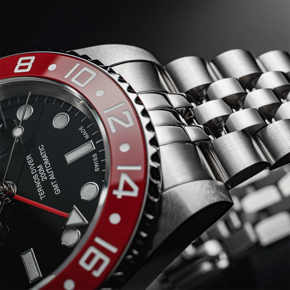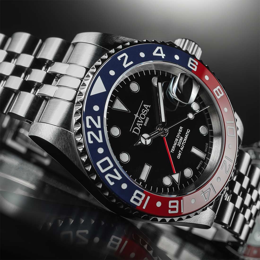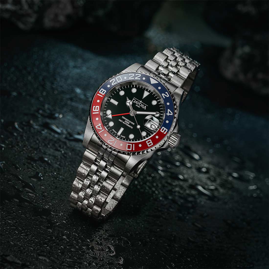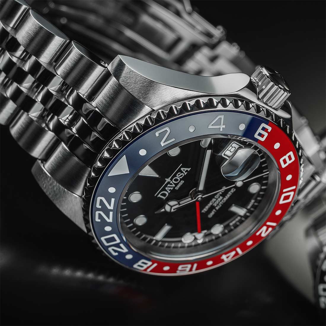 Koperta ze stali szlachetnej ma 40 mm średnicy i została zaprojektowana z myślą o uniwersalnym charakterze – doskonale sprawdza się zarówno podczas nurkowania, jak i w codziennym użytkowaniu. W jej wnętrzu pracuje mechanizm automatyczny Davosa DAV 3032 (na bazie Sellita SW330-1) z rezerwą chodu 56 godzin. Czas prezentowany jest na czarnej tarczy, gdzie masywne indeksy i wskazówki pokryto warstwą Super-LumiNova® BGW09, zapewniającą intensywną czytelność w ciemności. Czerwona wskazówka GMT ułatwia błyskawiczne odczytanie drugiej strefy czasowej.