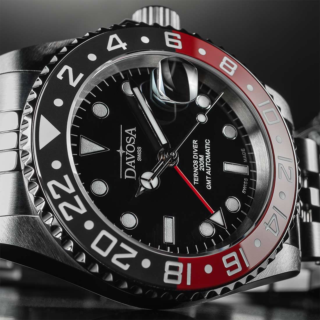 Koperta ze stali szlachetnej o szerokości 40 mm skrywa mechanizm automatyczny Davosa DAV 3032 (Sellita SW330-1), który oferuje 56 godzin rezerwy chodu. Czas prezentowany jest na czarnej tarczy, gdzie masywne indeksy i wskazówki pokryto warstwą Super-LumiNova® BGW09. Dzięki temu zegarek zachowuje pełną czytelność zarówno w ciemnych głębinach, jak i podczas nocnych podróży. Czerwona wskazówka GMT wyróżnia się na tle tarczy, pozwalając błyskawicznie sprawdzić czas drugiej strefy.