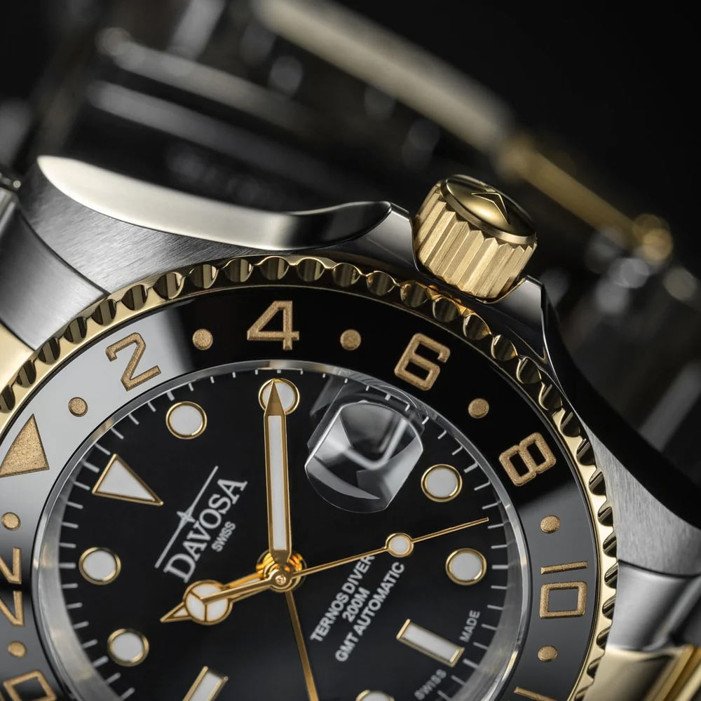 Dwukolorowy bezel ceramiczny w odcieniach czerni i złota wyposażono w 24-godzinną podziałkę. Jego odporność na zarysowania sprawia, że zegarek zachowuje swój prestiżowy wygląd przez lata. Ochronę zapewnia również szkło szafirowe z powłoką antyrefleksyjną, uzupełnione o lupkę nad datownikiem, która zwiększa czytelność wskazań. Zakręcana koronka i dekiel oraz wodoszczelność na poziomie 200 m (20 ATM) czynią ten zegarek pełnoprawnym diverem, gotowym do podwodnych wyzwań.