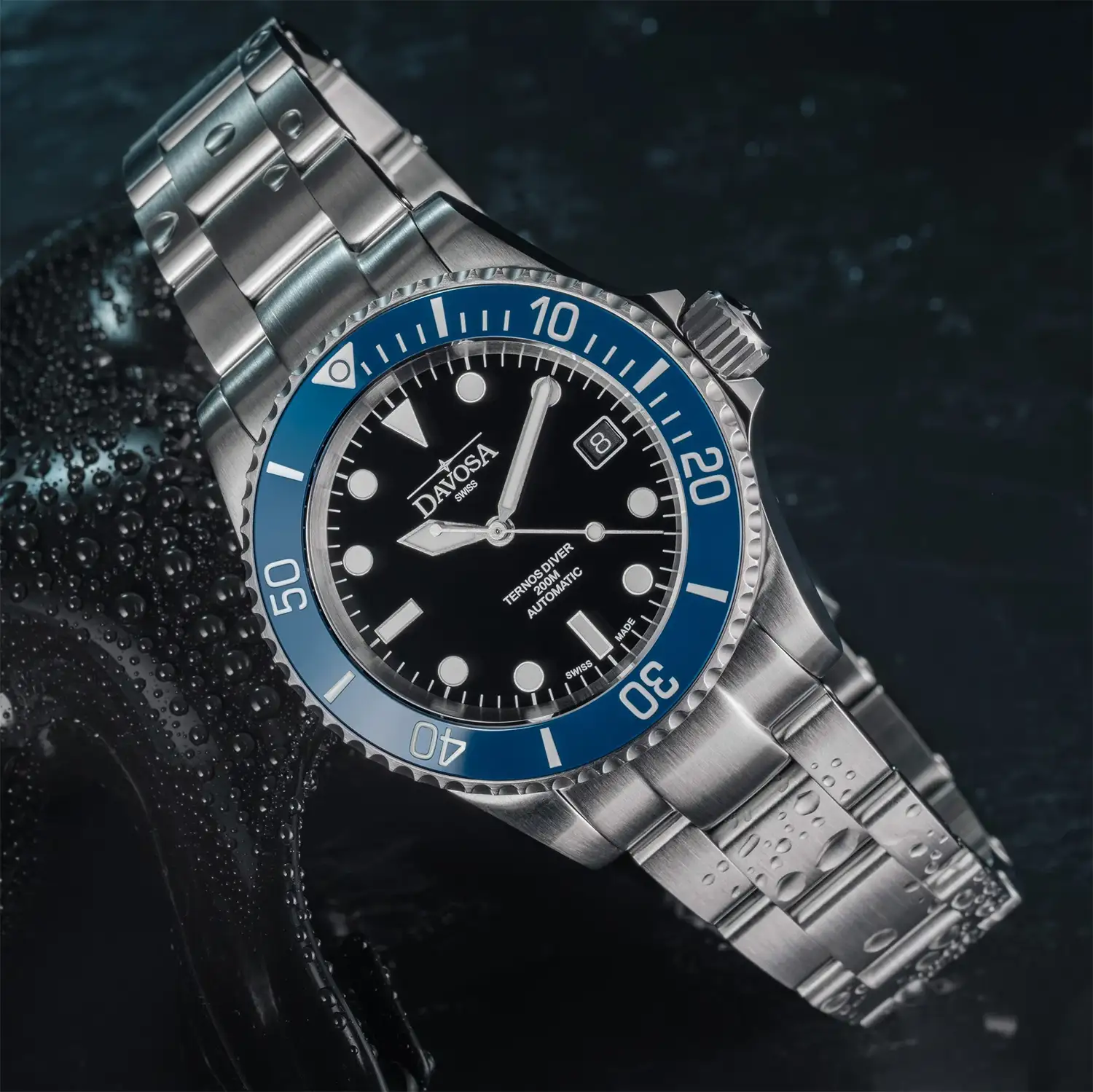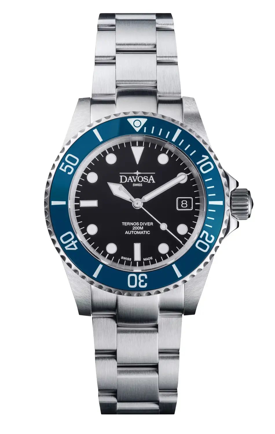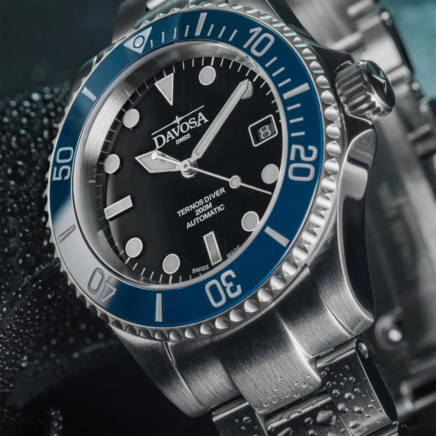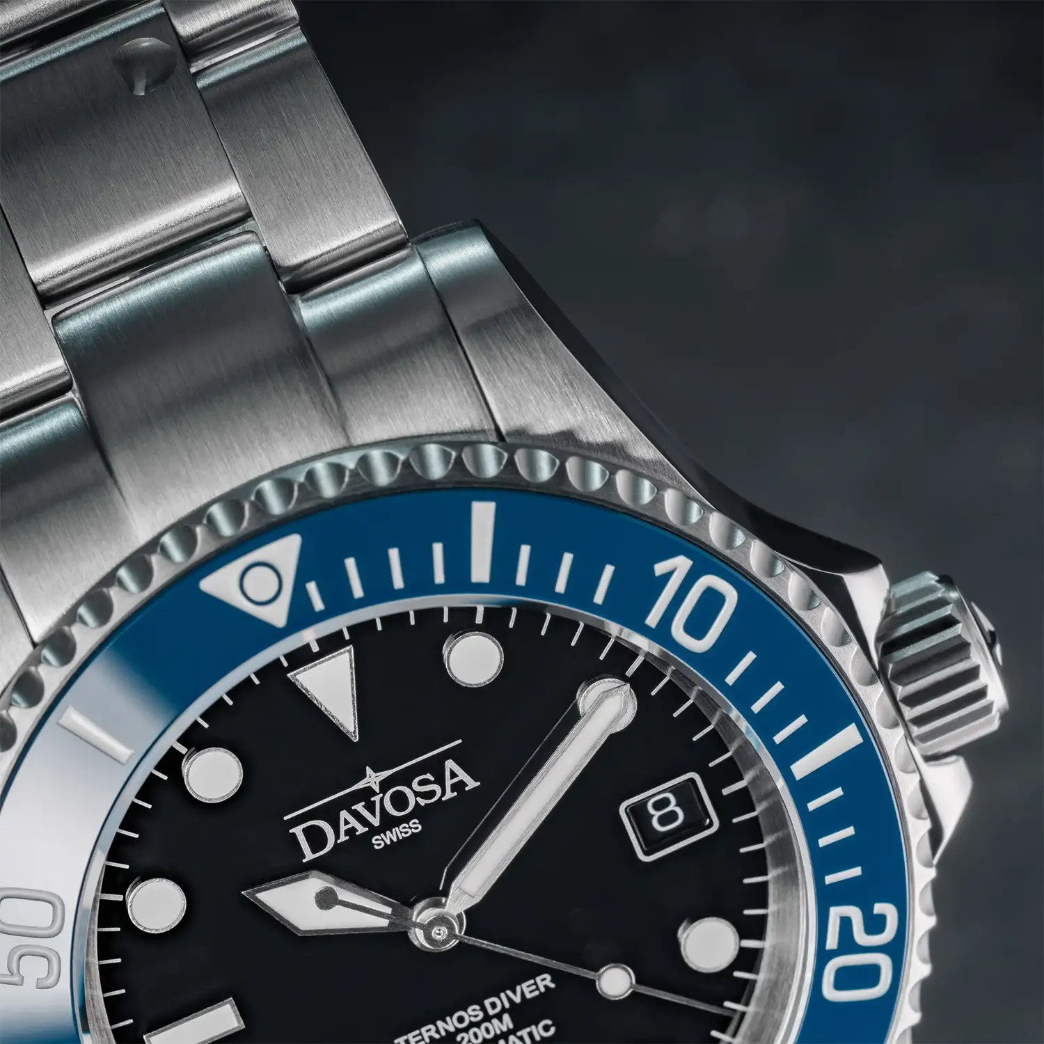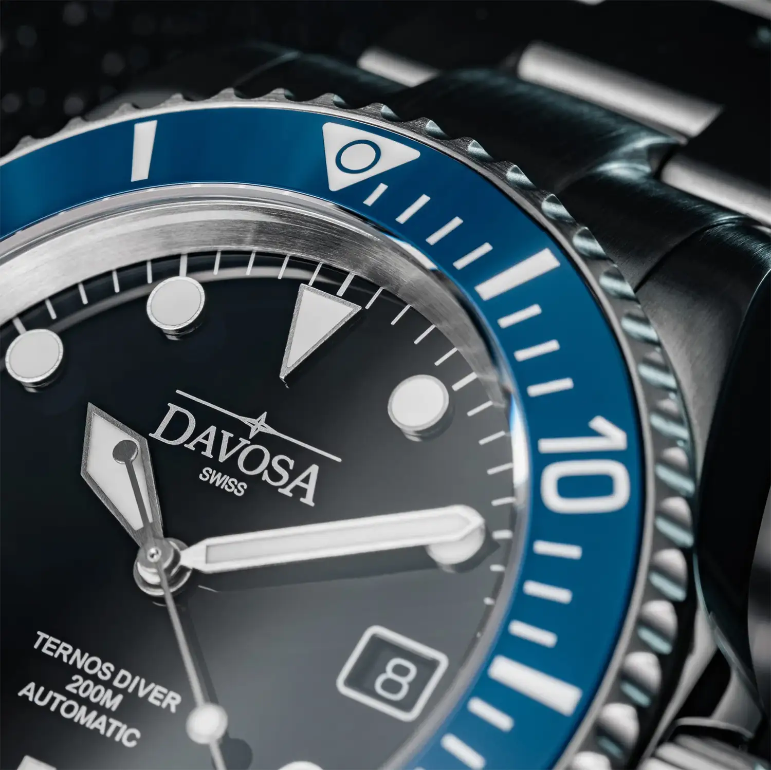 Davosa Ternos Diver 161.550.40 to zegarek nurkowy, który wyróżnia się świeżym, bardziej dynamicznym charakterem, zachowując przy tym klasyczne proporcje i szwajcarską dyscyplinę wykonania. Głęboki, niebieski pierścień lunety wprowadza wyraźny akcent kolorystyczny, kojarzący się z otwartą wodą i przestrzenią, a czarna tarcza stanowi dla niego czytelne, spokojne tło. Całość zamknięto w stalowej kopercie o średnicy 40 mm, która doskonale układa się na nadgarstku i sprawdzi się zarówno w codziennym użytkowaniu, jak i w bardziej wymagających warunkach.