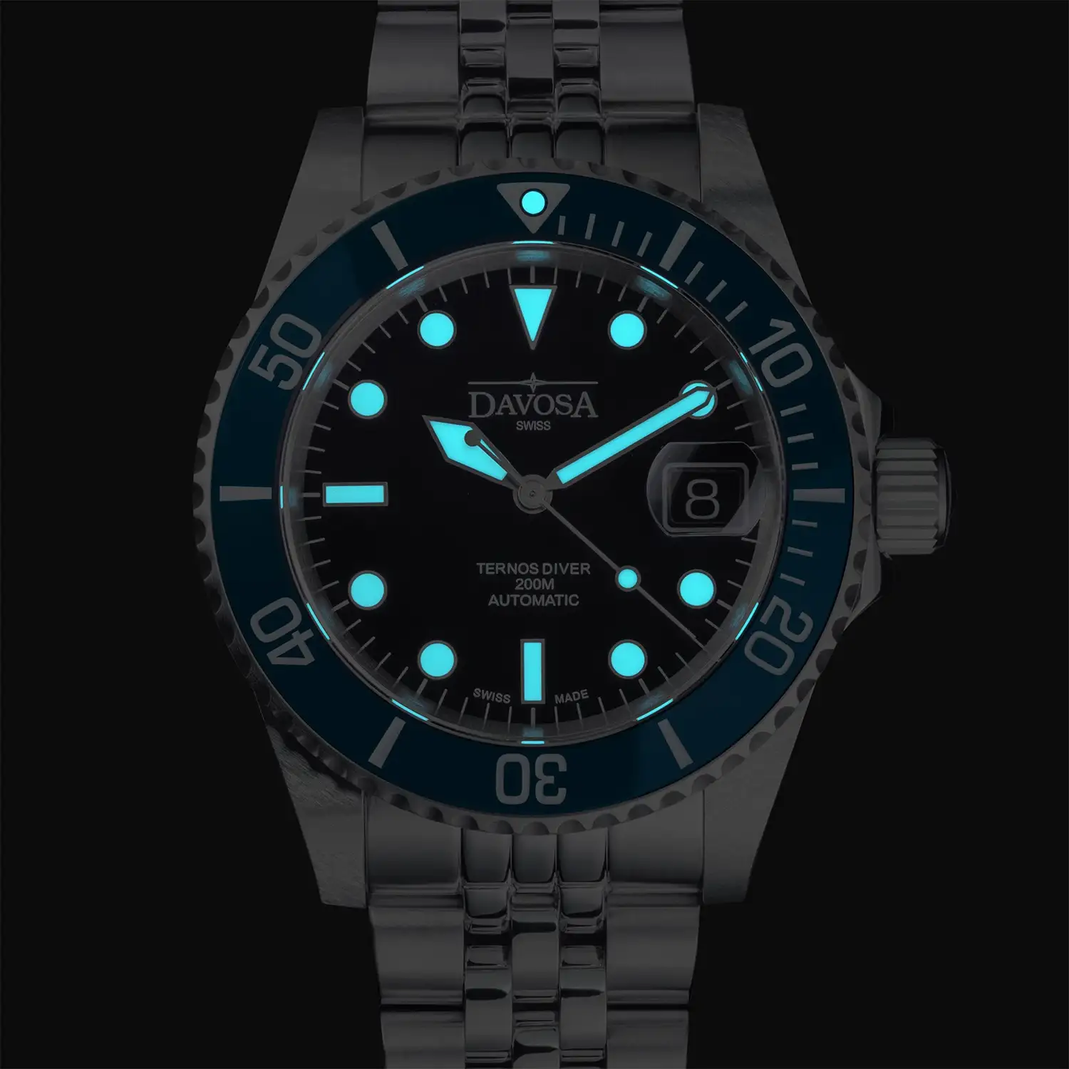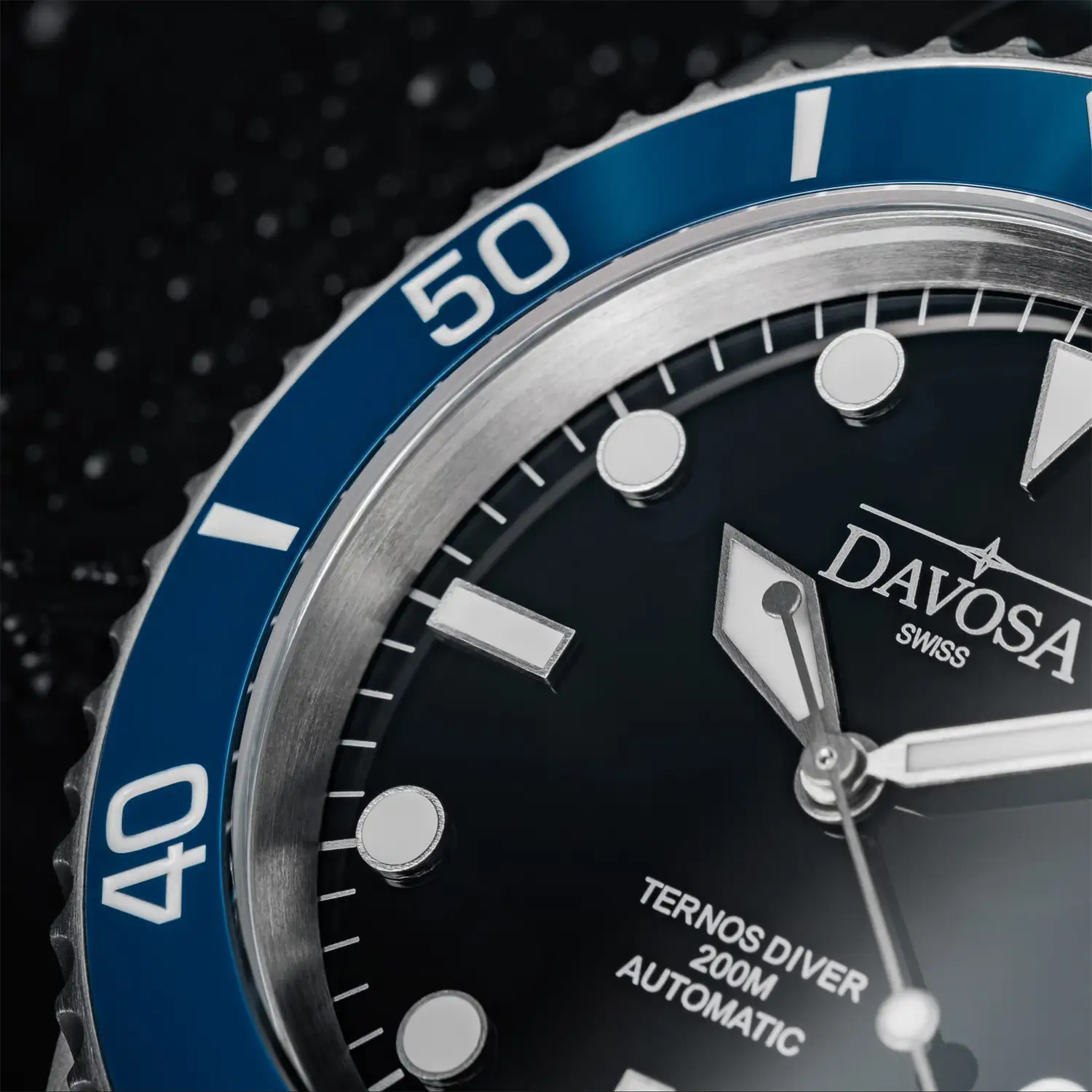 Davosa Ternos Diver 161.552.04 to klasyczny zegarek męski nurkowy, który łączy sprawdzoną stylistykę divera z wyraźnym, bardziej eleganckim akcentem. Czarna tarcza zestawiona z niebieską lunetą ceramiczną tworzy harmonijną, czytelną kompozycję, a charakterystyczna stalowa bransoleta typu Jubilee, określana przez Davosę jako TriaLink, nadaje całości subtelnie biżuteryjny charakter, bez utraty sportowej tożsamości.