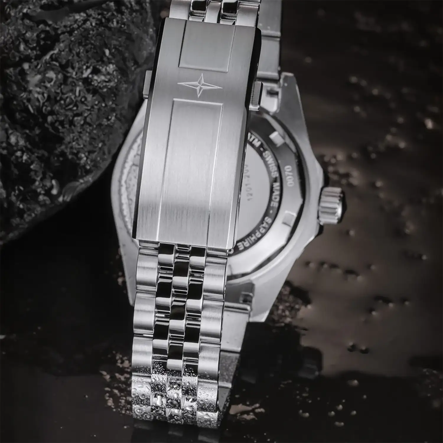 Jednokierunkowy bezel z ceramiczną wkładką wyróżnia się wysoką odpornością na zarysowania, promieniowanie UV oraz działanie słonej wody. Jego precyzyjna skala minutowa pozwala na bezpieczną kontrolę czasu pod wodą, a głęboki odcień niebieskiego koloru przywołuje skojarzenia z otwartym morzem. Pod szafirowym szkłem z powłoką antyrefleksyjną znajduje się czytelna tarcza z dużymi indeksami oraz wskazówkami wypełnionymi Super-LumiNova® BGW9, emitującą intensywne, niebieskie światło w warunkach ograniczonej widoczności.