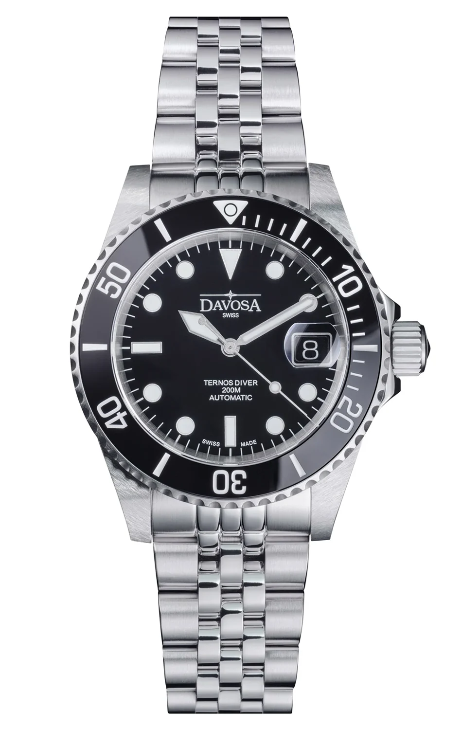 Davosa Ternos Diver 161.552.05 szwajcarski zegarek automatyczny 200M z czarną tarczą, ceramicznym bezelem i bransoletą Jubilee Pentalink. Styl, precyzja i wytrzymałość w jednym.