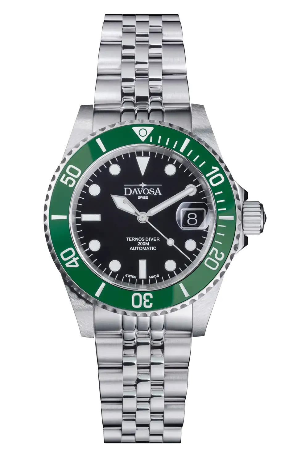 Szwajcarski zegarek męski nurkowy z zieloną lunetą ceramiczną i bransoletą Jubilee TriaLink. Wodoszczelność 200 m sprawia, że to idealny diver do pływania, nurkowania i codziennego noszenia.