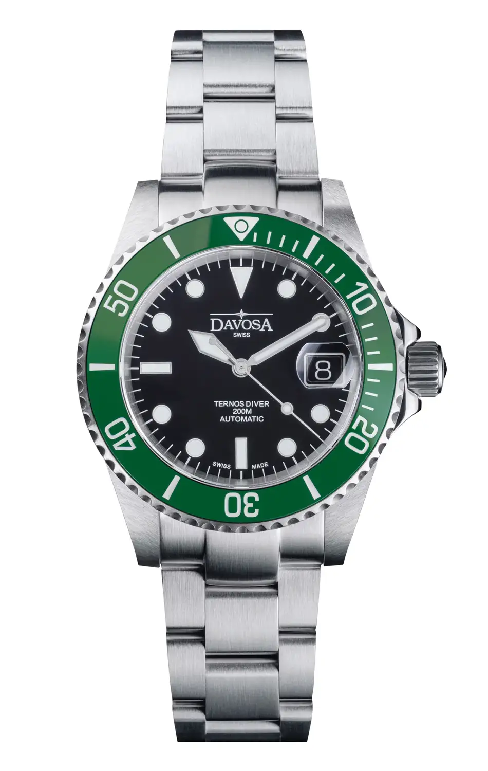 Davosa Ternos Diver 161.552.70 to szwajcarski zegarek męski nurkowy, który wyróżnia się bardziej wyrazistą, dynamiczną stylistyką, zachowując przy tym klasyczną funkcjonalność profesjonalnego divera. Zielona luneta ceramiczna wprowadza charakterystyczny, sportowy akcent, coraz częściej poszukiwany przez osoby szukające zegarka nurkowego o indywidualnym stylu. Czarna tarcza stanowi dla niej wyraźne, kontrastowe tło, a stalowa koperta o średnicy 40 mm zachowuje idealne proporcje do codziennego noszenia.