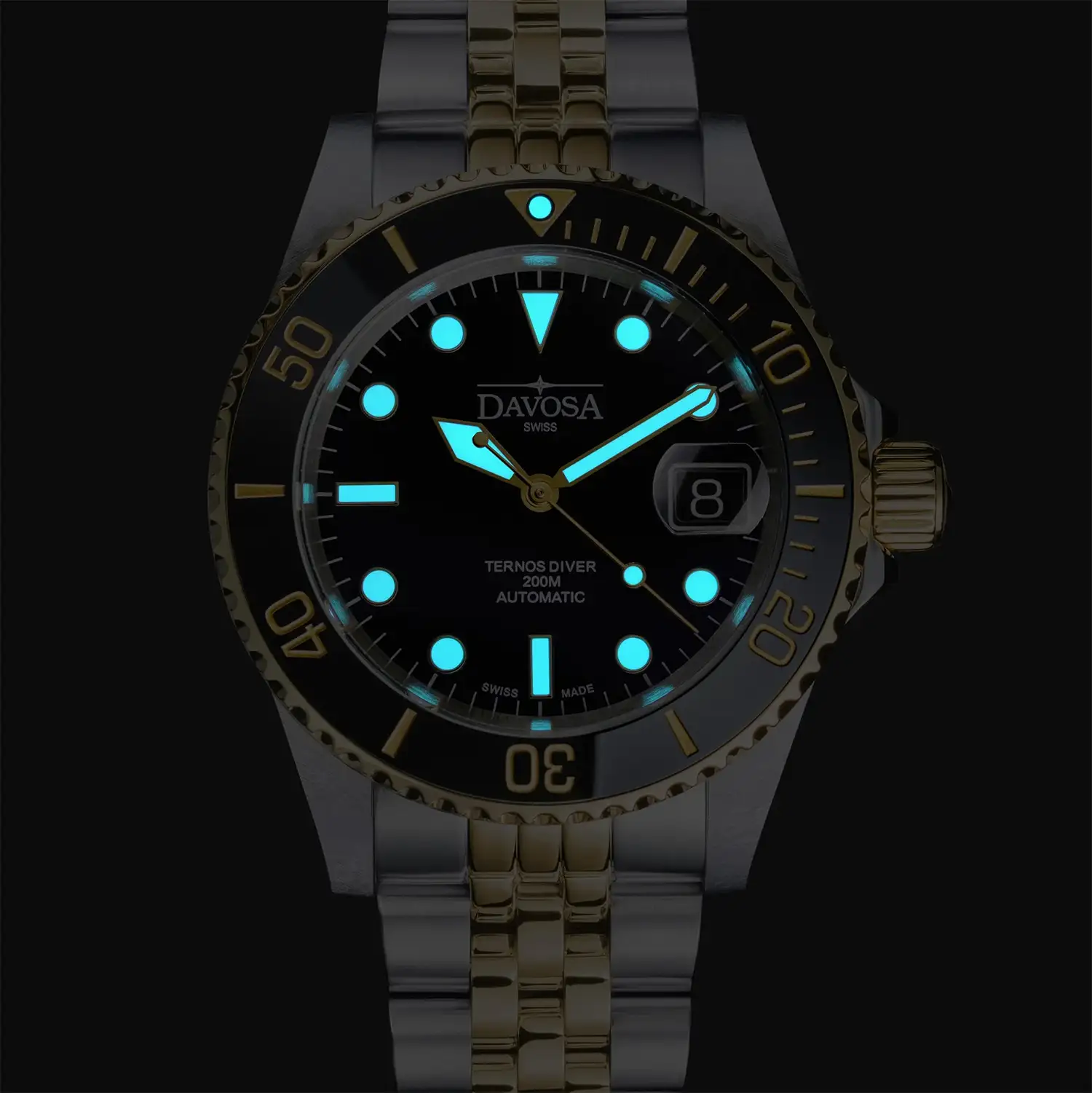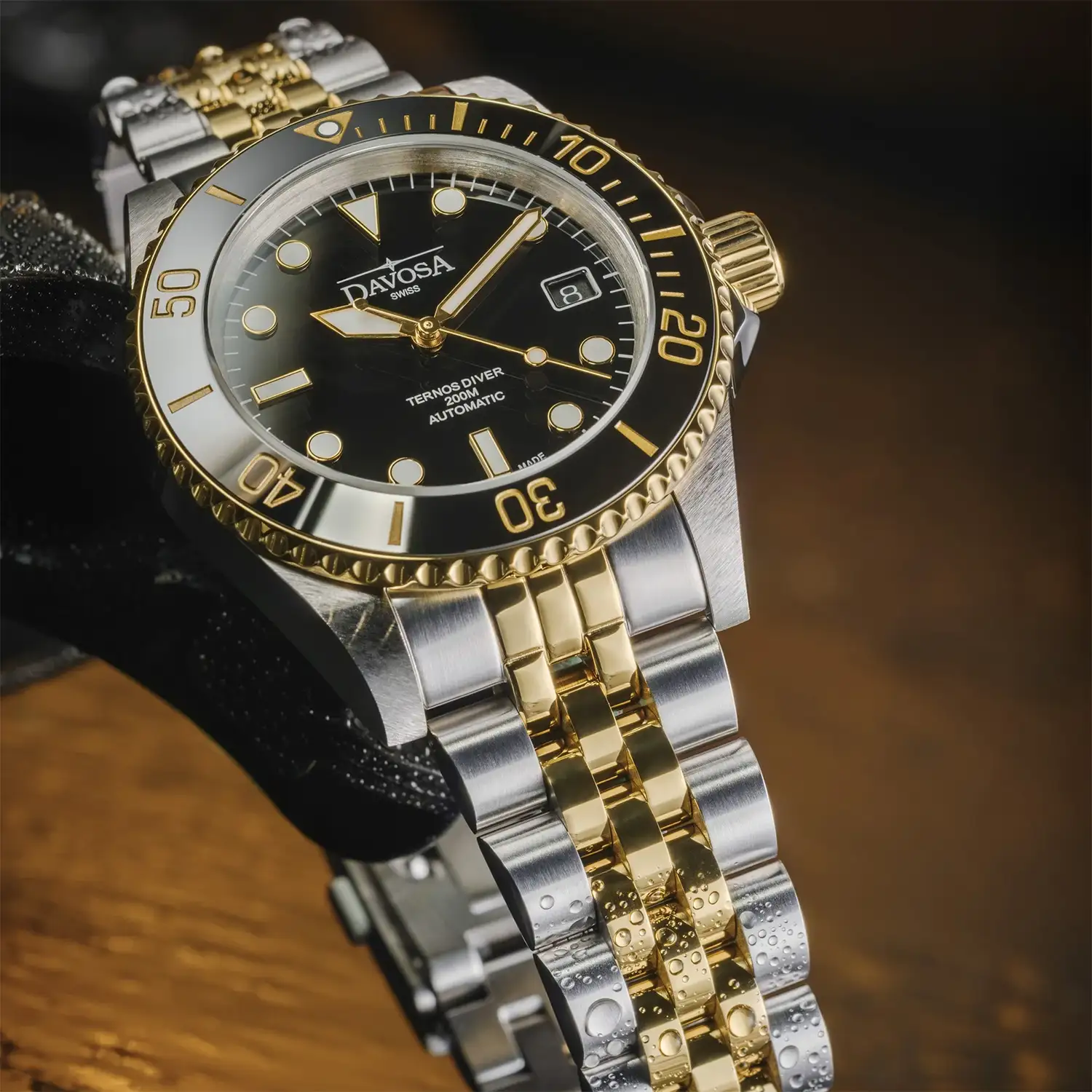 Davosa Ternos Diver 161.553.05 to męski zegarek nurkowy, który łączy klasyczną estetykę divera ze szlachetnym, dwukolorowym wykończeniem. Połączenie stali szlachetnej z elementami w kolorze złota nadaje mu bardziej elegancki charakter, zachowując jednocześnie pełną funkcjonalność zegarka do pływania i nurkowania. Czarna tarcza tworzy wyraźny kontrast dla złoconych indeksów i wskazówek, zapewniając czytelność w każdych warunkach.