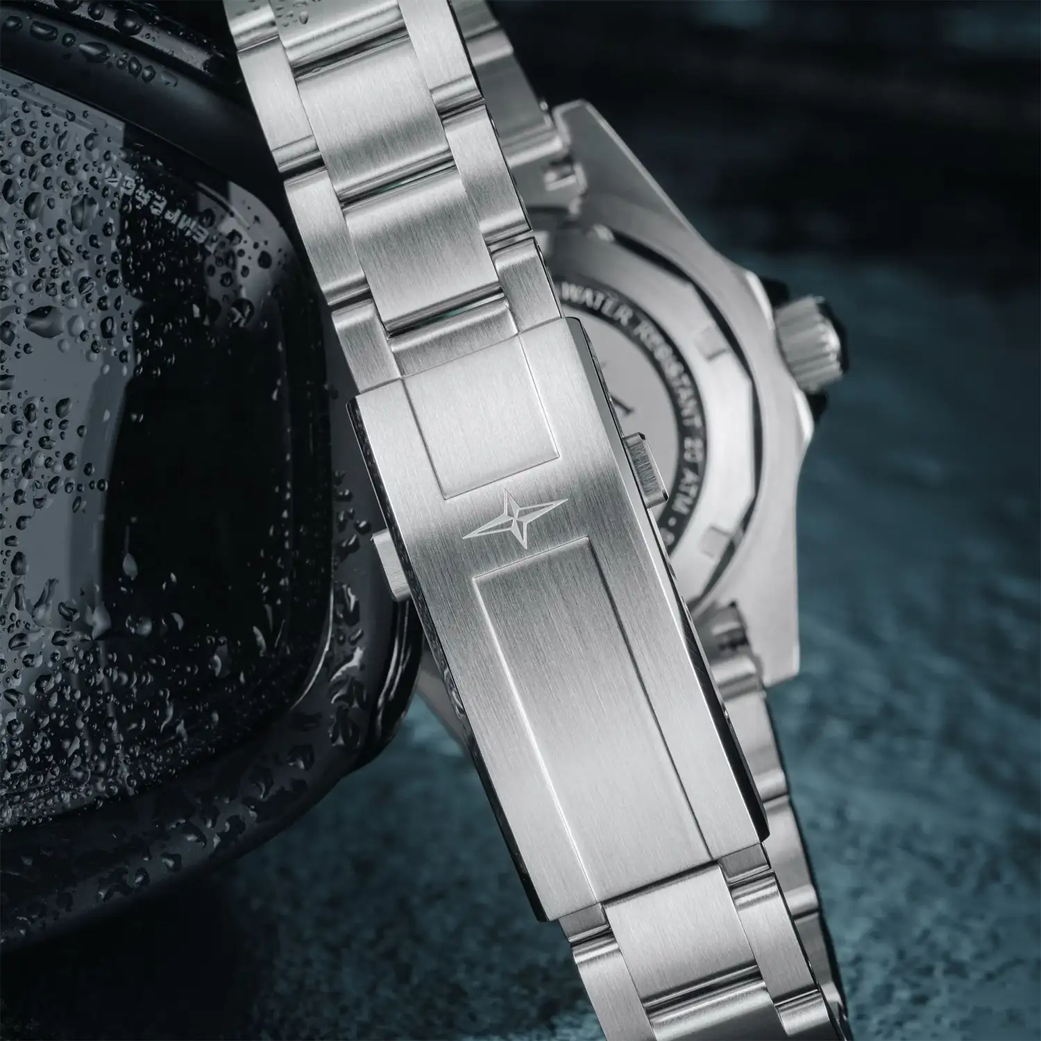 Niebieski cyferblat otrzymała wykończenie sunburst, dzięki czemu gra światła na jej powierzchni przywodzi na myśl refleksy na spokojnej tafli wody. Jaśniejszy środek harmonijnie przechodzi w ciemniejszą krawędź, budując efekt głębi, który dodatkowo podkreślają nałożone indeksy i charakterystyczne wskazówki z masą luminescencyjną SuperLumiNova w jasnoniebieskim kolorze. Jednokierunkowa luneta z wysokotechnologicznej ceramiki o twardości 1250 HV jest odporna na zarysowania, temperaturę i działanie słonej wody, a jej połysk świetnie koresponduje z gradientem tarczy.