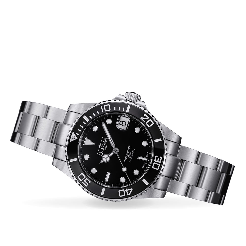 Proponowany model w stylu nurkowym z kolekcji TERNOS spełnia kryteria wysokiej jakości, udokumentowanej sygnaturą SWISS MADE, a także wizualnej klasy. Jej owoc widać nie tylko w srebrno-czarnej kolorystyce, ale również w składających się na tożsamość urządzenia dwojakich kształtach oznaczeń godzinowych, czy w dodających sportowego wydźwięku wskazówkach. Wspomniane oznaczenia godzinowe — te na tarczy — wraz ze wskazówkami pokryte zostały substancją luminescencyjną. Jej zadaniem jest oświetlanie tych elementów w sytuacji braku światła niezbędnego do odczytu czasu. Rozwiązanie to docenią z pewnością osoby znajdujące się w zaciemnionych, podwodnych zakątkach. Szwajcarscy producenci umieścili na zegarku dodatkową podziałkę minutową obecnej na czarnym pierścieniu z nowoczesnej ceramiki. Jej celem jest wygodniejsza orientacja w przedziale minutowym, a także uzupełnienie sportowego designu. Wśród funkcji znajduje się także datownik na godzinie trzeciej, który wyjątkowo zawiera w sobie lupkę powiększającą. Cyferblat osłania najwyższej jakości szkło szafirowe, na które nałożona jest powłoka antyrefleksyjna. Samo szkło cechuje nieskazitelna przejrzystość natomiast dzięki swej specyfice, gwarantuje wysoką odporność na zarysowania. Dodatkowo, za sprawą powłoki zapewnia odbicie niepożądanych refleksów słonecznych, działając na rzecz dokładnego odczytu godziny w każdych warunkach świetlnych. Koperta z koronką i bransoletą wykonane zostały ze stali szlachetnej, która uchroni powierzchnię części przed korozją.