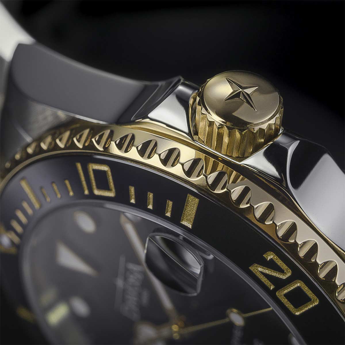 Zegarek w stylu nurkowym z kolekcji TERNOS spełnia kryteria wysokiej jakości, udokumentowanej sygnaturą SWISS MADE, a także wizualnej klasy. Jej owoc widać nie tylko w czarno złotej kolorystyce, ale również w składających się na tożsamość urządzenia dwojakich kształtach oznaczeń godzinowych, czy w dodających sportowego wydźwięku wskazówkach. Wspomniane oznaczenia godzinowe — te na tarczy — wraz ze wskazówkami pokryte zostały substancją luminescencyjną. Jej zadaniem jest oświetlanie tych elementów w sytuacji braku światła niezbędnego do odczytu czasu. Rozwiązanie to docenią z pewnością osoby znajdujące się w zaciemnionych, podwodnych zakątkach. Szwajcarscy producenci umieścili na zegarku dodatkową podziałkę minutową obecnej na czarnym pierścieniu z nowoczesnej nierysującej się ceramiki. Wśród funkcji znajduje się także datownik na godzinie trzeciej, który wyjątkowo zawiera w sobie lupkę powiększającą. Cyferblat osłania najwyższej jakości szkło szafirowe, na które nałożona jest powłoka antyrefleksyjna. Samo szkło cechuje nieskazitelna przejrzystość natomiast dzięki swej specyfice, gwarantuje wysoką odporność na zarysowania. Dodatkowo, za sprawą powłoki zapewnia odbicie niepożądanych refleksów słonecznych, działając na rzecz dokładnego odczytu godziny w każdych warunkach świetlnych. Koperta z koronką i bransoletą w stylu jubile wykonane zostały ze stali szlachetnej z elementami złoconymi żółtym złotem PVD.