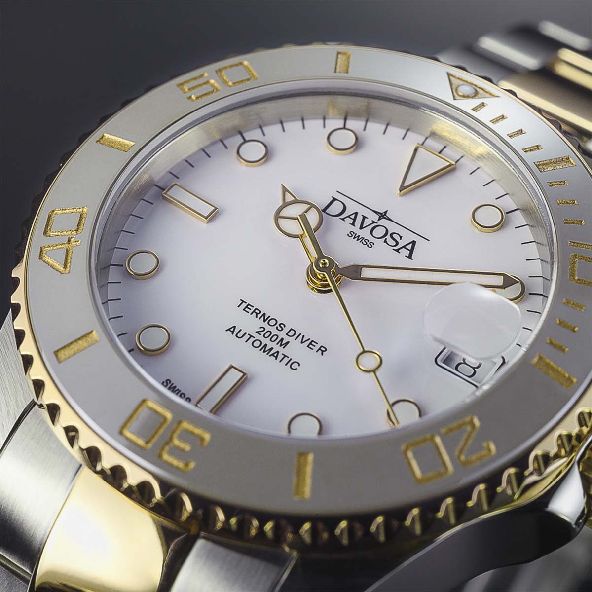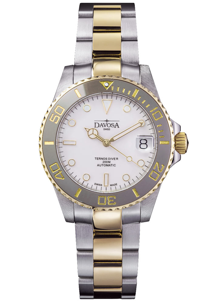 Zegarek w stylu nurkowym z kolekcji TERNOS spełnia kryteria wysokiej jakości, udokumentowanej sygnaturą SWISS MADE, a także wizualnej klasy. Jej owoc widać nie tylko w biało złotej kolorystyce, ale również w składających się na tożsamość urządzenia dwojakich kształtach oznaczeń godzinowych, czy w dodających sportowego wydźwięku wskazówkach. Wspomniane oznaczenia godzinowe — te na tarczy — wraz ze wskazówkami pokryte zostały substancją luminescencyjną. Jej zadaniem jest oświetlanie tych elementów w sytuacji braku światła niezbędnego do odczytu czasu. Rozwiązanie to docenią z pewnością osoby znajdujące się w zaciemnionych, podwodnych zakątkach. Szwajcarscy producenci umieścili na zegarku dodatkową podziałkę minutową obecnej na szarym pierścieniu z nowoczesnej nierysującej się ceramiki. Wśród funkcji znajduje się także datownik na godzinie trzeciej, który wyjątkowo zawiera w sobie lupkę powiększającą. Cyferblat osłania najwyższej jakości szkło szafirowe, na które nałożona jest powłoka antyrefleksyjna. Samo szkło cechuje nieskazitelna przejrzystość natomiast dzięki swej specyfice, gwarantuje wysoką odporność na zarysowania. Dodatkowo, za sprawą powłoki zapewnia odbicie niepożądanych refleksów słonecznych, działając na rzecz dokładnego odczytu godziny w każdych warunkach świetlnych. Koperta z koronką i bransoletą wykonane zostały ze stali szlachetnej z elementami złoconymi żółtym złotem PVD.
