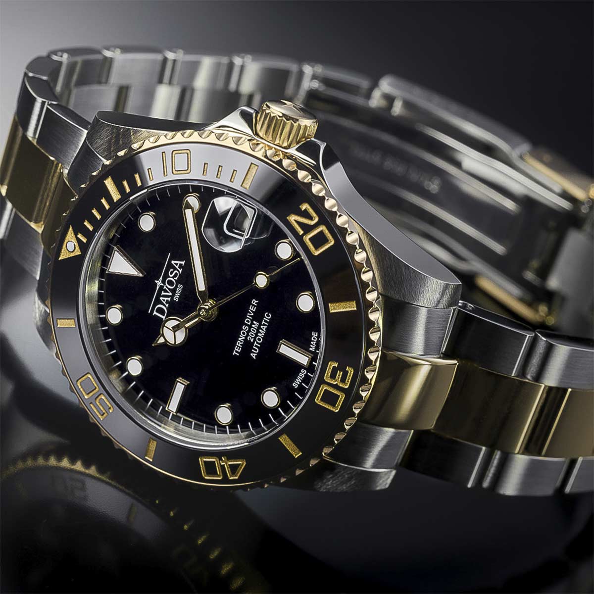 Zegarek w stylu nurkowym z kolekcji TERNOS spełnia kryteria wysokiej jakości, udokumentowanej sygnaturą SWISS MADE, a także wizualnej klasy. Jej owoc widać nie tylko w czarno złotej kolorystyce, ale również w składających się na tożsamość urządzenia dwojakich kształtach oznaczeń godzinowych, czy w dodających sportowego wydźwięku wskazówkach. Wspomniane oznaczenia godzinowe — te na tarczy — wraz ze wskazówkami pokryte zostały substancją luminescencyjną. Jej zadaniem jest oświetlanie tych elementów w sytuacji braku światła niezbędnego do odczytu czasu. Rozwiązanie to docenią z pewnością osoby znajdujące się w zaciemnionych, podwodnych zakątkach. Szwajcarscy producenci umieścili na zegarku dodatkową podziałkę minutową obecnej na czarnym pierścieniu z nowoczesnej nierysującej się ceramiki. Wśród funkcji znajduje się także datownik na godzinie trzeciej, który wyjątkowo zawiera w sobie lupkę powiększającą. Cyferblat osłania najwyższej jakości szkło szafirowe, na które nałożona jest powłoka antyrefleksyjna. Samo szkło cechuje nieskazitelna przejrzystość natomiast dzięki swej specyfice, gwarantuje wysoką odporność na zarysowania. Dodatkowo, za sprawą powłoki zapewnia odbicie niepożądanych refleksów słonecznych, działając na rzecz dokładnego odczytu godziny w każdych warunkach świetlnych. Koperta z koronką i bransoletą wykonane zostały ze stali szlachetnej z elementami złoconymi żółtym złotem PVD.