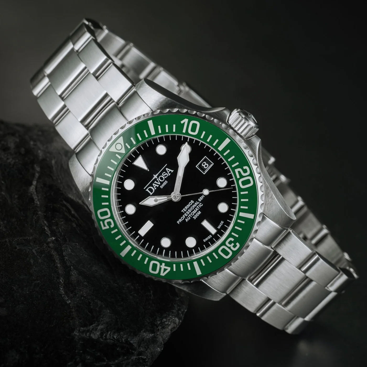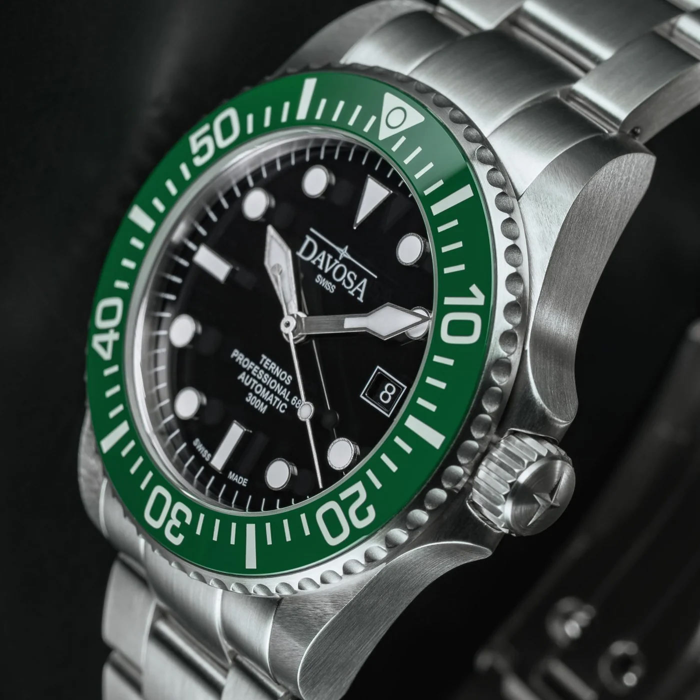 Zegarek Davosa Ternos Professional 68H 16153870 oferowany jest w rozmiarze 42 mm — doskonale dopasuje się do męskiego nadgarstka. Czasomierz ten jest przystosowany do odkrywania podwodnego świata — jego wodoszczelność do 300 metrów gwarantuje bezpieczeństwo konstrukcji podczas nurkowania. Na godzinie trzeciej umieszczono zakręcaną koronkę z symbolem marki, stylizowaną na różę kompasu. Na froncie zegarka Davosa znajduje się obrotowa luneta z zieloną, ceramiczną wkładką, na której naniesiona została skala minutowa. Wkładka wykonana z zaawansowanej technologicznie ceramiki jest wyjątkowo odporna na zarysowania. Nurkowy zegarek Davosa zestawiony został z bransoletą TriaLink ze stali nierdzewnej, która jest łatwa w regulacji dzięki systemowi WaveSlide, niewymagającemu dodatkowych narzędzi.