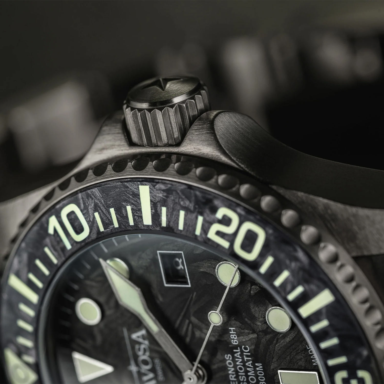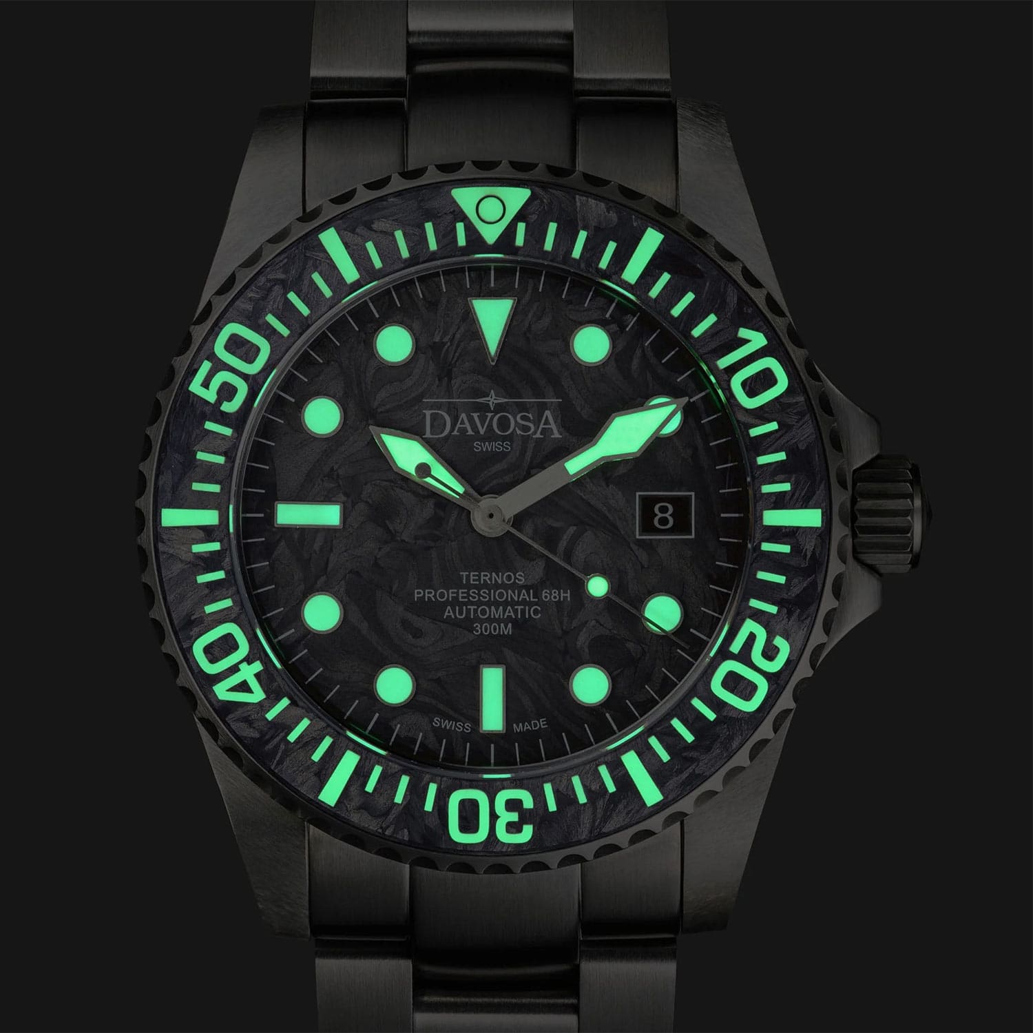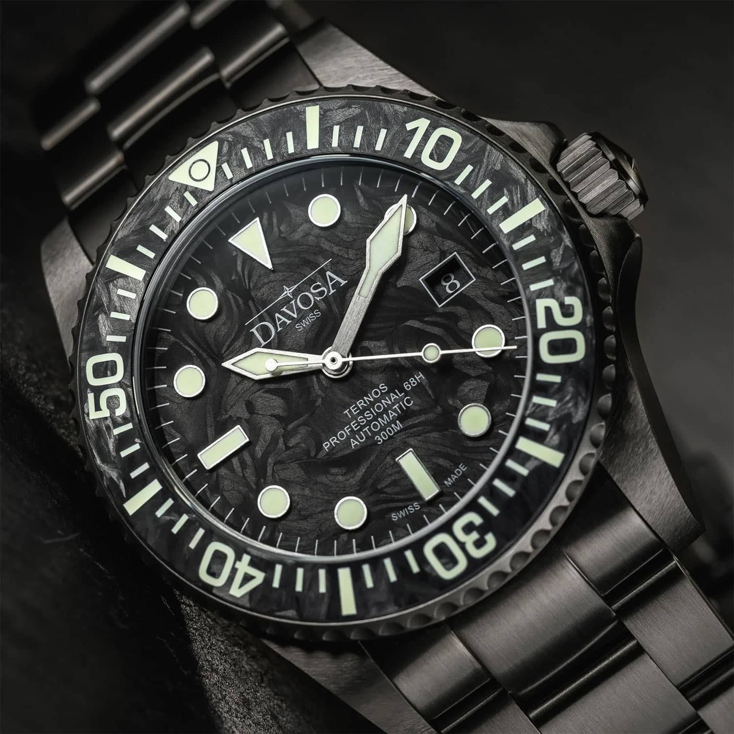 Tarcza zegarka Davosa Ternos Professional 68H LE została wykonana z kutego węgla, znanego również jako forged carbon. Ten zaawansowany technologicznie materiał wyróżnia się niezwykłą kombinacją lekkości i wytrzymałości. Dzięki specjalnemu procesowi produkcji powstaje unikatowy wzór, będący efektem losowego układu włókien węglowych. Matowa, aksamitnie gładka powierzchnia Forged Carbon nadaje zegarkowi elegancki wygląd i idealnie współgra z antracytową, szarą kopertą, podkreślając unikalność każdego egzemplarza. Wyjątkowe właściwości luminescencyjne zapewnia materiał Super-LumiNova® BGW9, który w naturalnym świetle jest biały, a w ciemności emituje wyraźne, niebieskie światło. Tarcza jest niezwykle czytelna i zaprojektowana w nurkowym stylu. O jej bezpieczeństwo dba odporne na zarysowania, antyrefleksyjne szkło szafirowe.