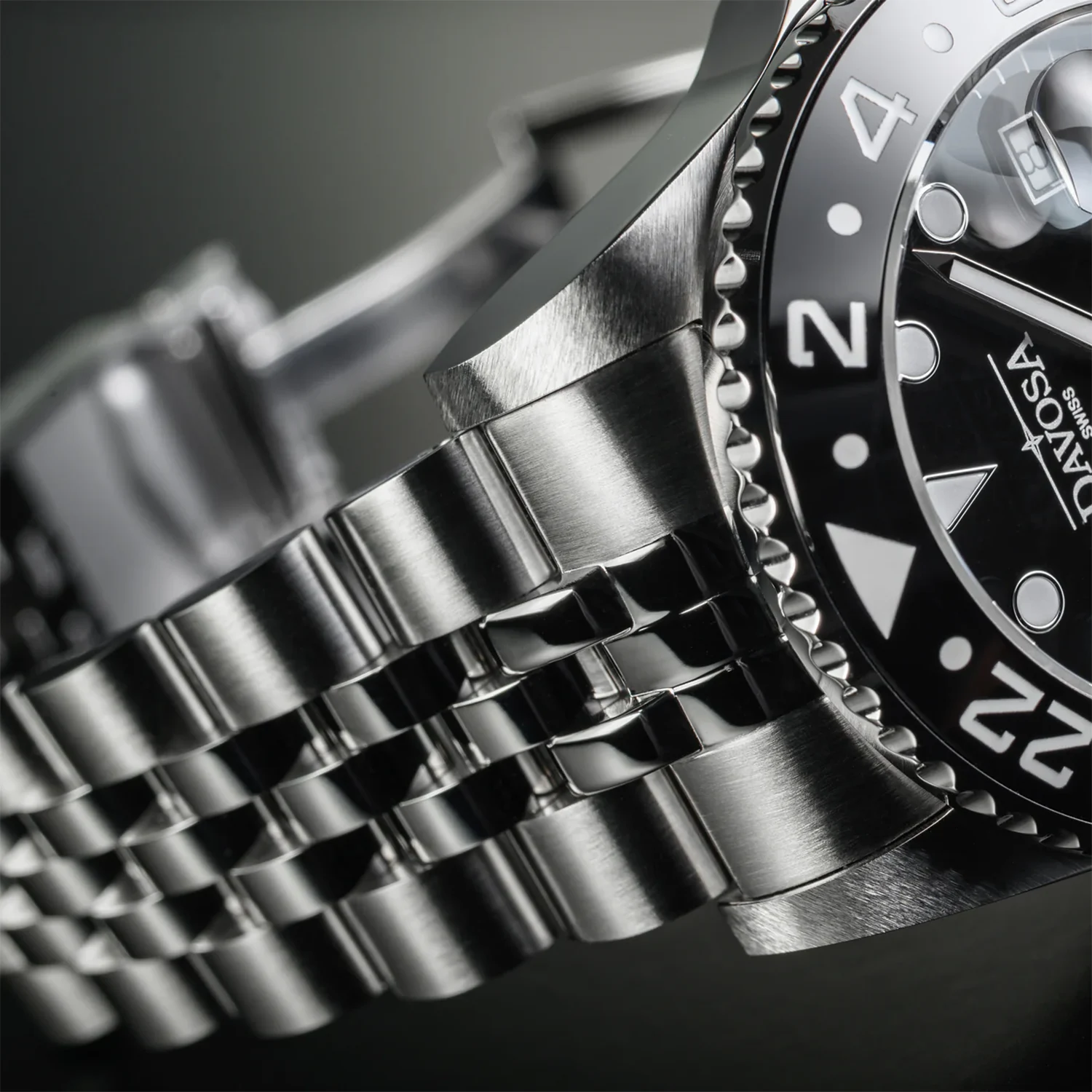 Najbardziej charakterystycznym elementem tego modelu jest czarny ceramiczny bezel z podziałką 24-godzinną. Wykonany z wysokiej jakości ceramiki, jest odporny na zarysowania i dodaje zegarkowi wyrazistości oraz luksusowego charakteru. W połączeniu z dodatkową wskazówką GMT umożliwia on jednoczesne śledzenie dwóch stref czasowych – rozwiązanie szczególnie doceniane przez osoby często podróżujące.