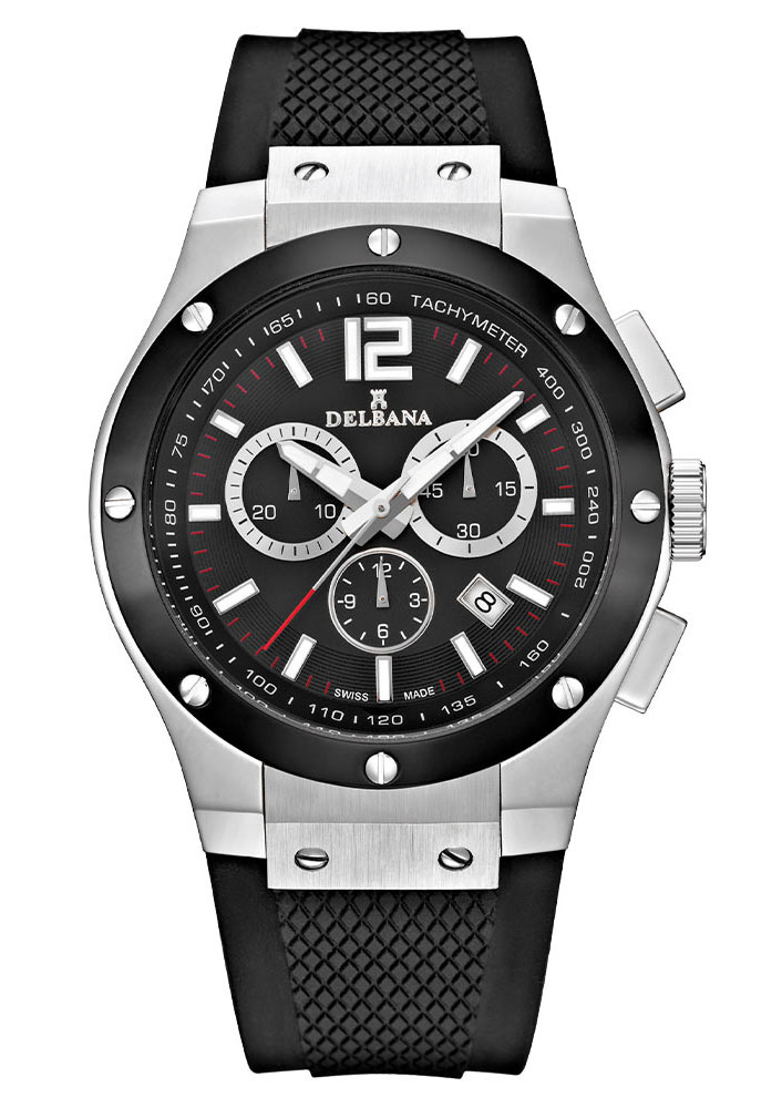 Tarcza jest niemal w całości spożytkowana, ilustrując nasycenie Manhattanu. W środku trzy totalizatory ze srebrnymi ramkami w różnych proporcjach wraz ze konturem prostokątnych, świecących indeksów, srebrnymi wskazaniami oraz prestiżowym logo Delbana z wieżą stylowo korespondują z obudową. Czarne tło korzystnie wpływa na czytelność i także dzieli język z lunetą oraz paskiem silikonowym o oryginalnym projekcie. Czerwone akcenty zauważalne na końcówce wskazówki sekundowej, jak i na kreskach skali minutowej nadają ostrego, dynamicznego temperamentu. Tarczę zabezpiecza najwyższej jakości szkło szafirowe wysoce odporne na zarysowania i przejrzyste. Model napędza niezawodny mechanizm kwarcowy Ronda 5030.D, dzięki któremu zegarek posiada dodatkowe funkcje, jak: chronograf, tachymetr, data.